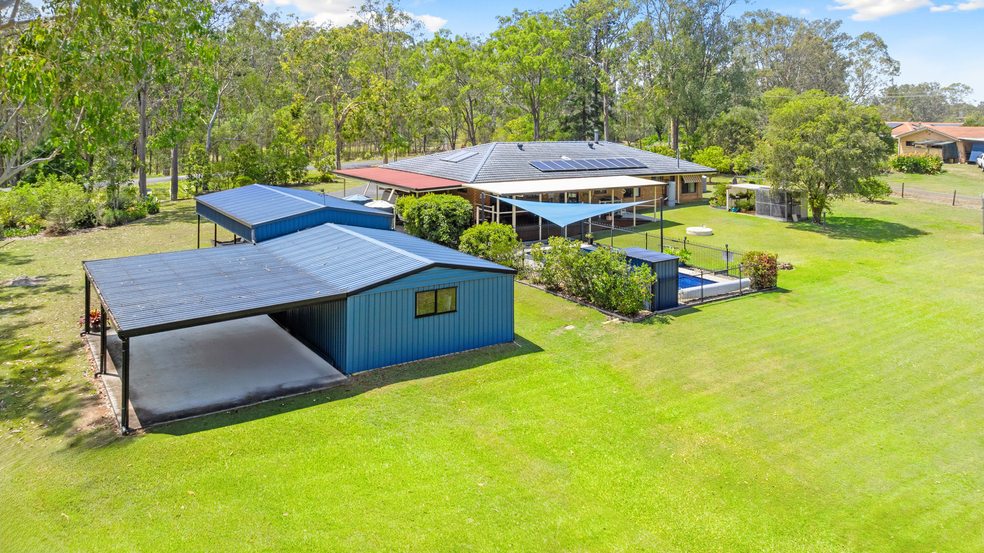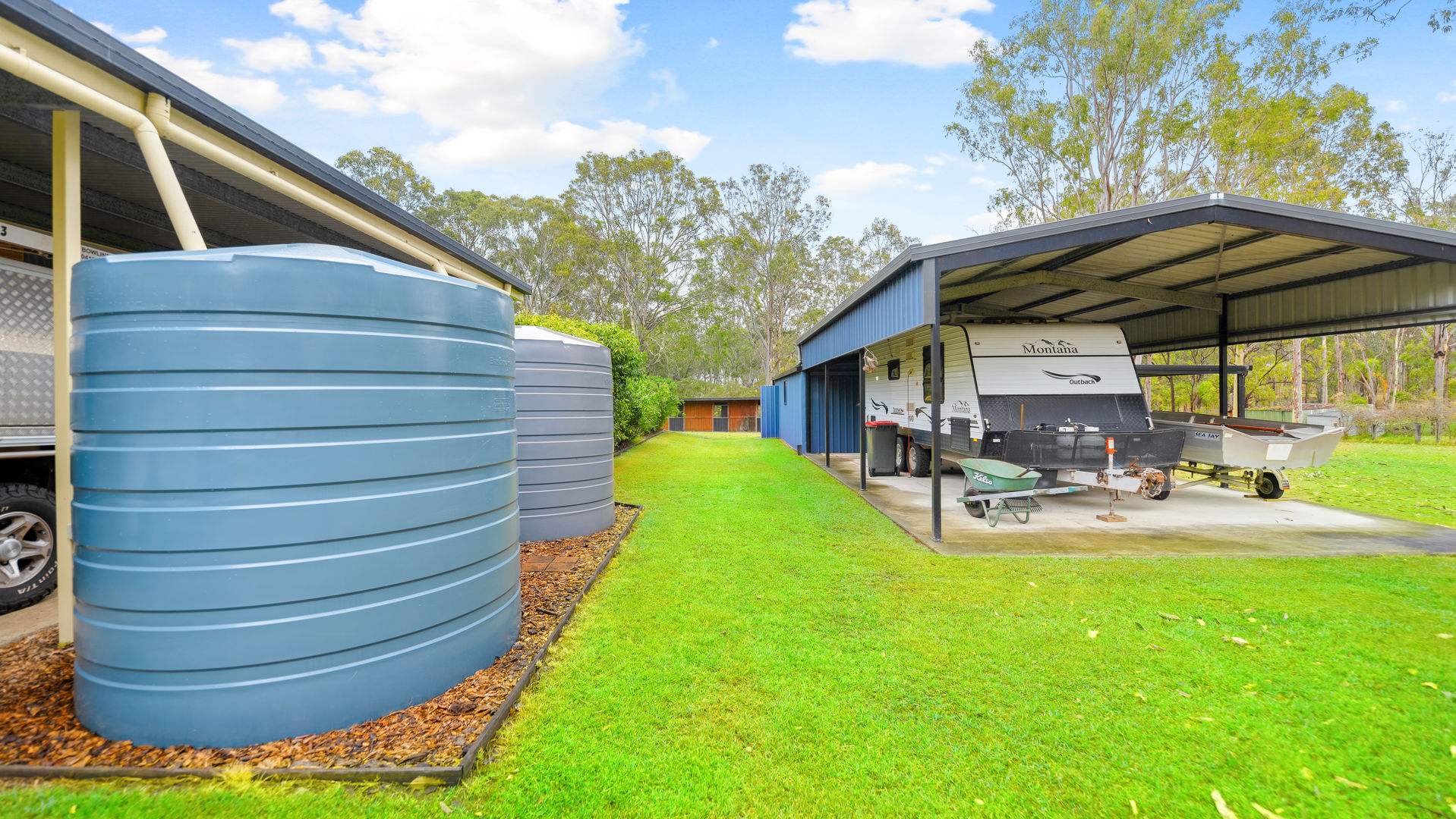 Car storage and workshop space are well-catered for with a double carport attached to the home, plus a large Colorbond garage and additional carport, providing plenty of room for vehicles, tools, or gear.