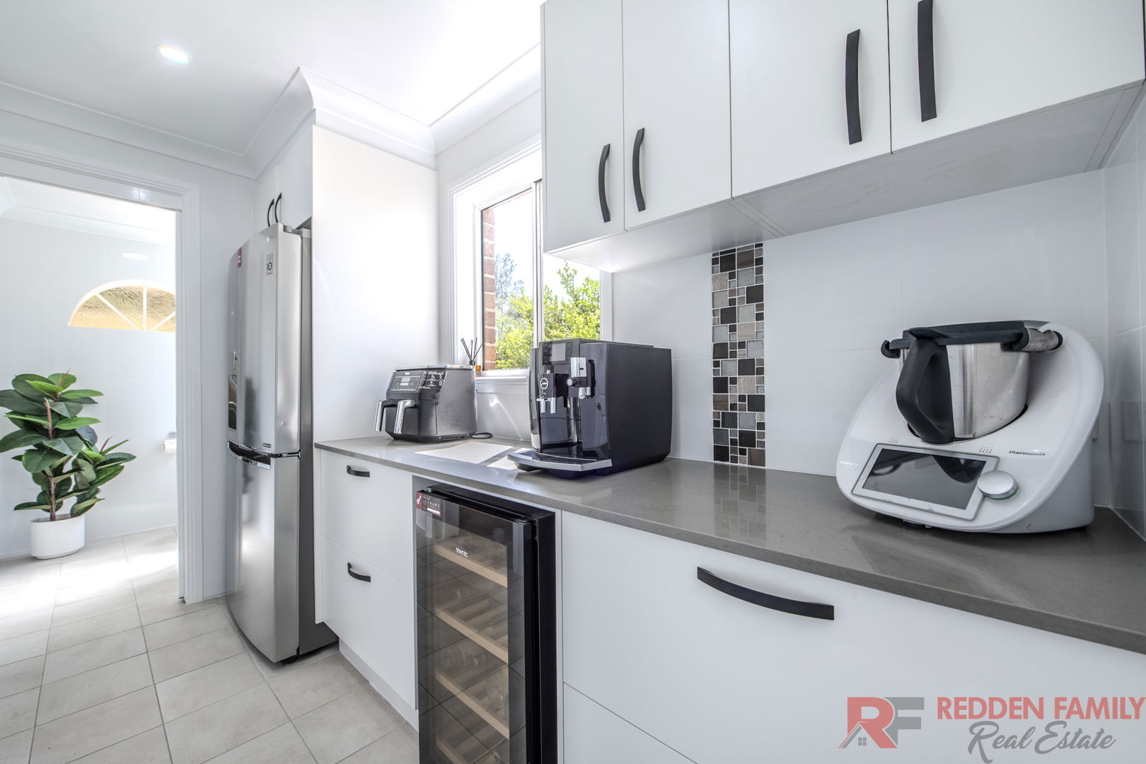 Upon entering through the automatic 1.8-metre gate, you’ll be welcomed by the spacious north-facing brick veneer home, surrounded by manicured lawns and established gardens. Inside, the home has been tastefully renovated and showcases a stunning modern entertainer’s kitchen complete with Caesarstone benchtops, quality appliances including a 900mm Westinghouse oven and induction cooktop, a dishwasher, a walk-in pantry, and a separate butler’s pantry.