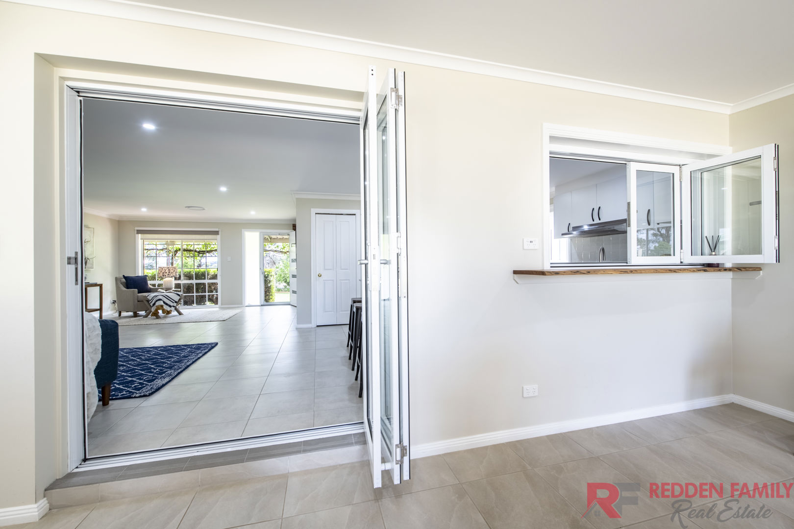 • Bi-fold serving window with timber bench and glass bi-folding doors connect kitchen and family rooms to the second living area