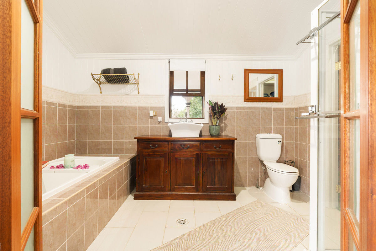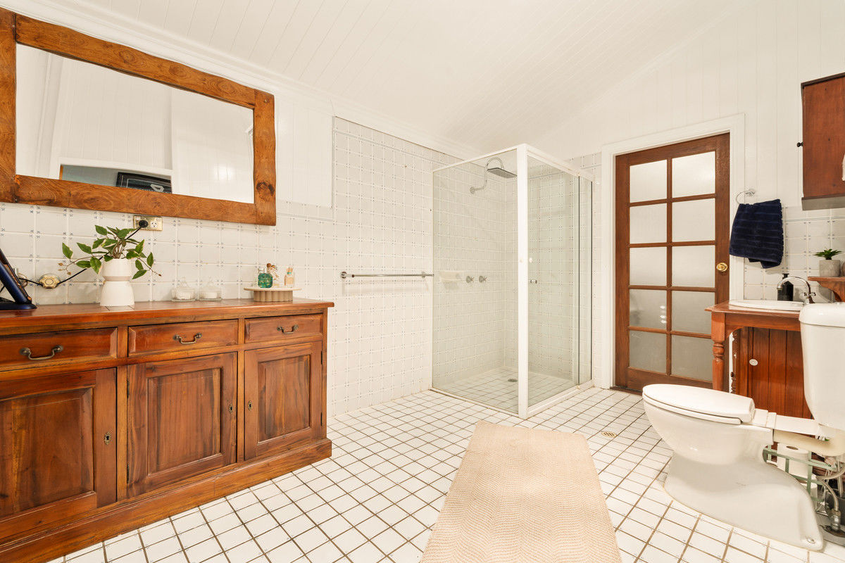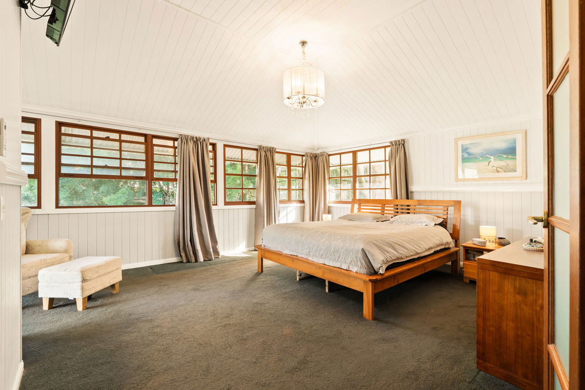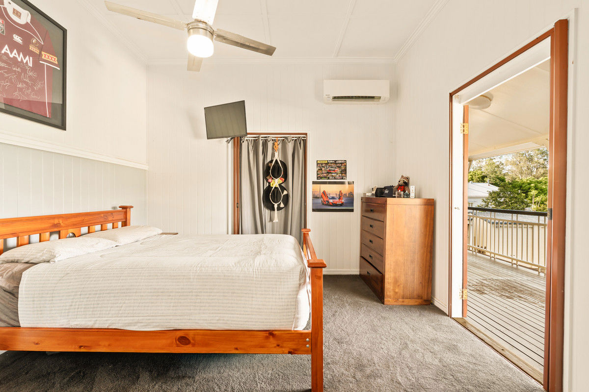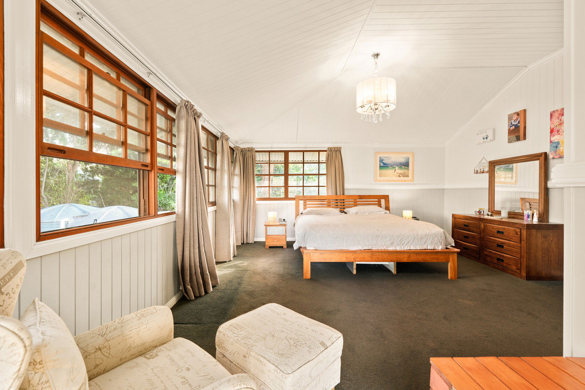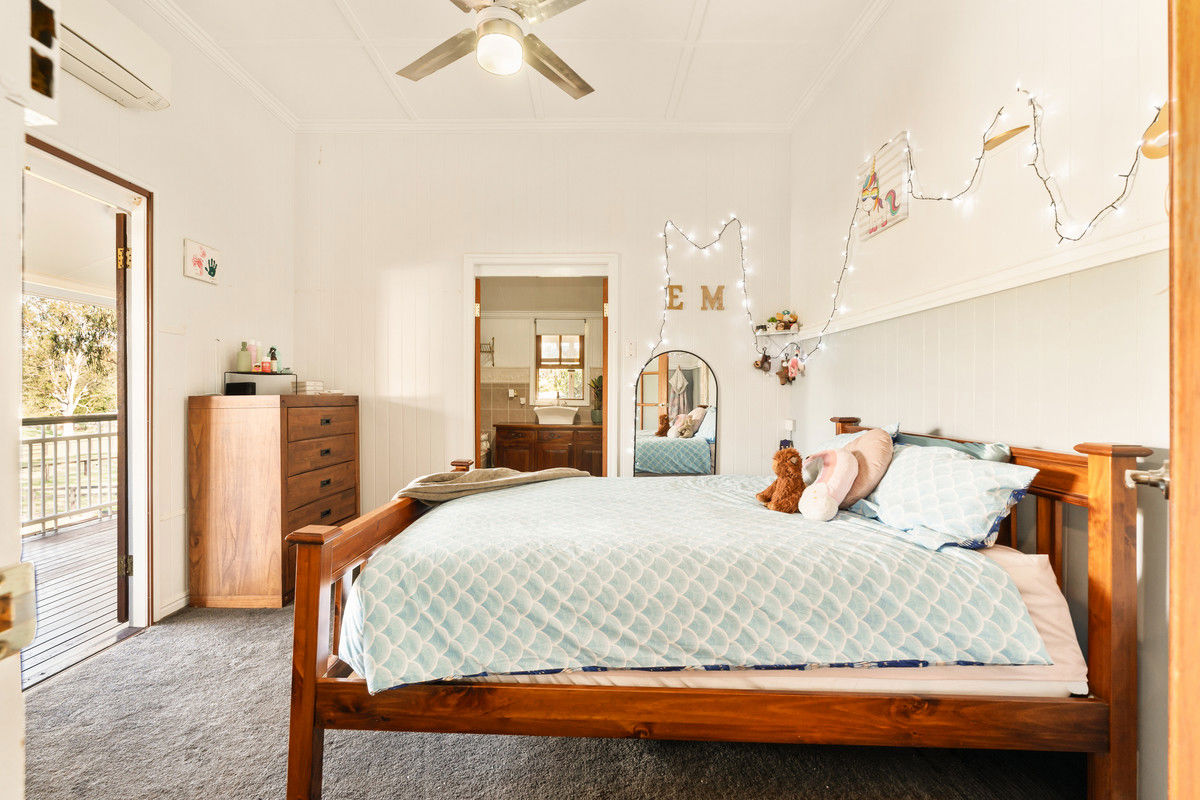 Upstairs, the home features three spacious bedrooms and two bathrooms, with air conditioning throughout. The main bedroom includes an ensuite and walk in robe, while bedroom two enjoys shared access to the same ensuite. Bedrooms one and two open onto the wide veranda, capturing refreshing breezes and stunning sunrises. The well-appointed kitchen boasts a butler's pantry, dishwasher, electric cooktop and oven, flowing into an open plan living and dining area with polished timber floors and high ceilings.