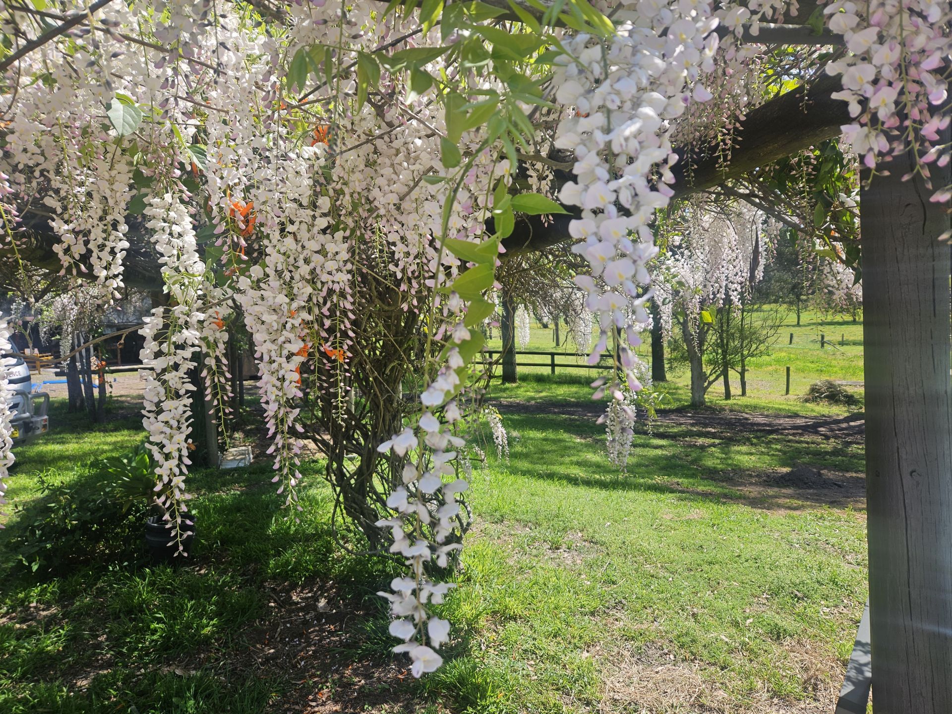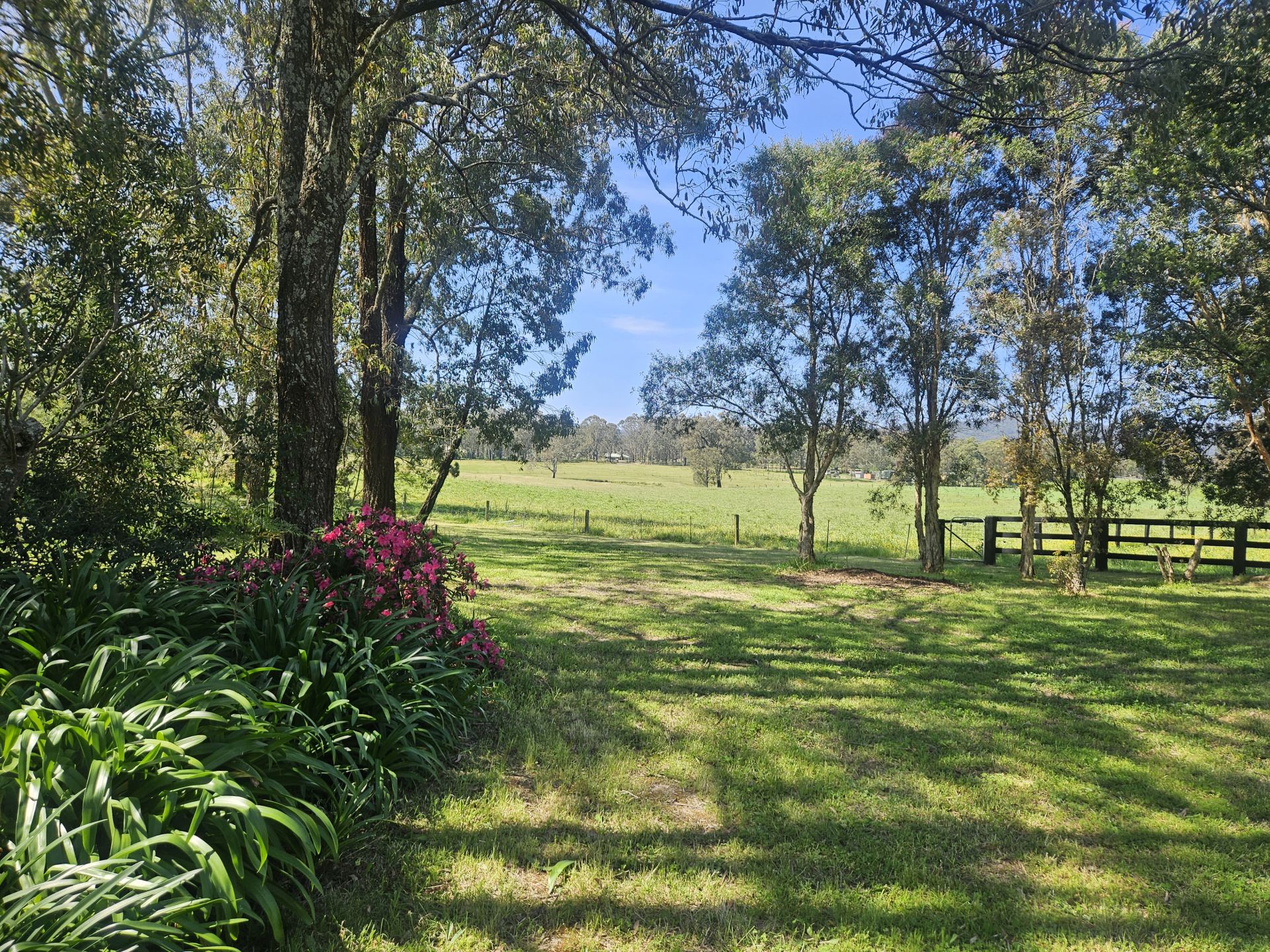 Gardens: a country gardeners dream garden with serene views out over the farm paddocks. Well-watered by reticulated watering system connected to a nearby dam. The garden is a delight, with evergreen and deciduous trees, rose gardens, hedgerows, lilies, irises, perfumed native frangipanis, magnolia, wisteria arbor, creepers, Liquid Ambers and Crab Apples. Sheltered by neighboring timbered hills, the garden is a peaceful haven and secure area for children to play.