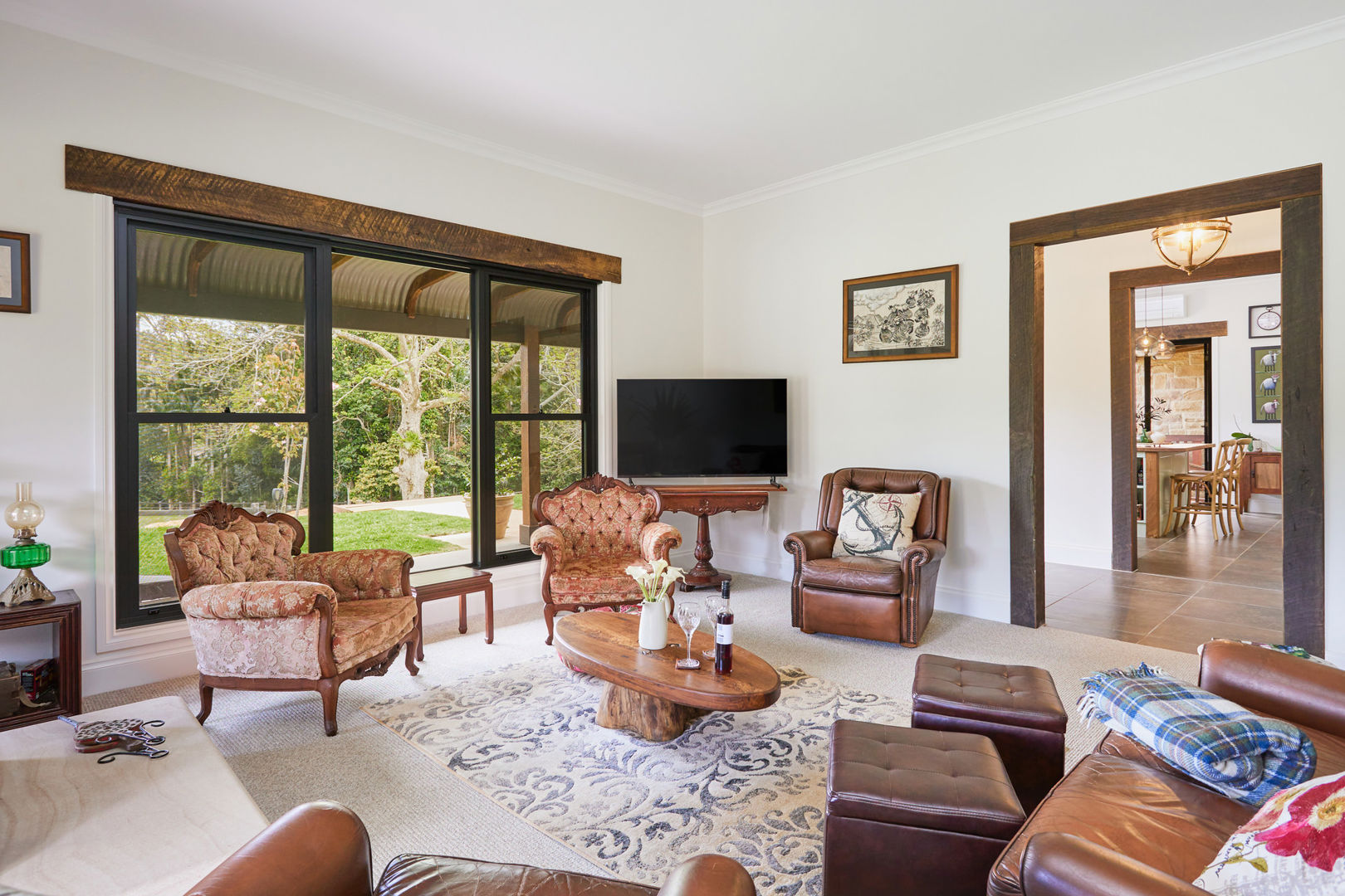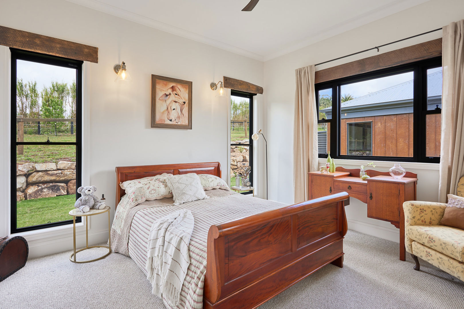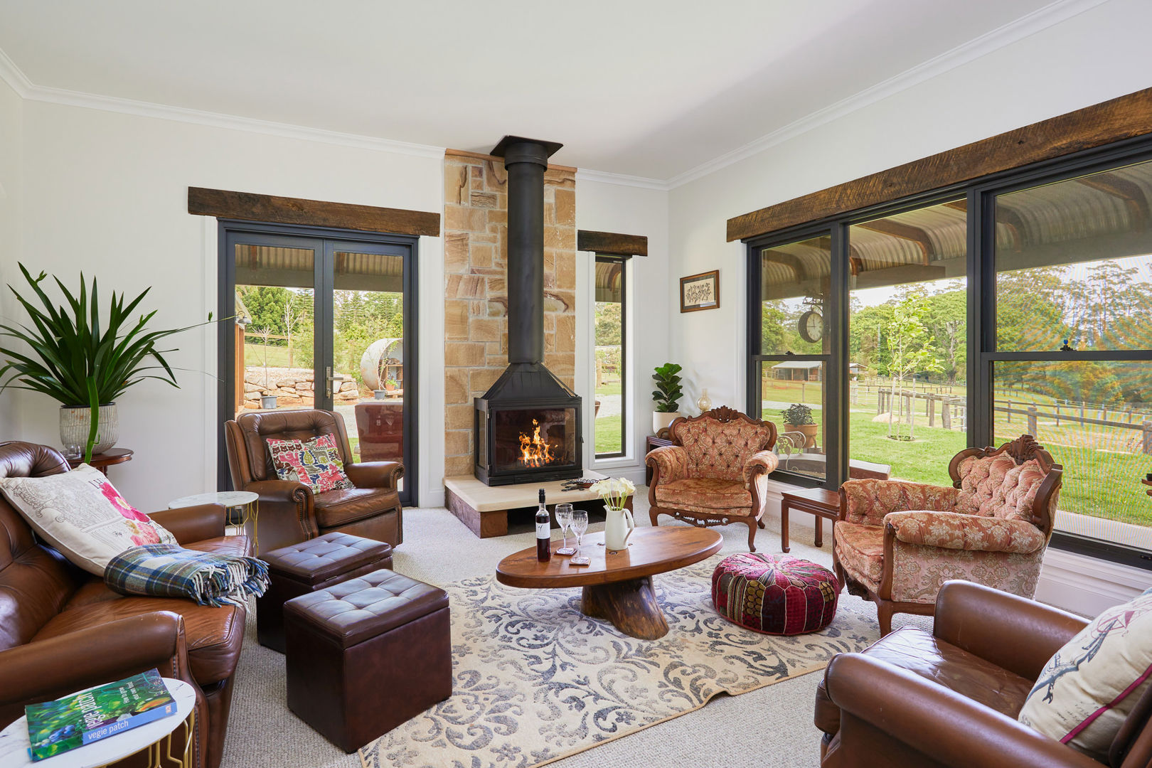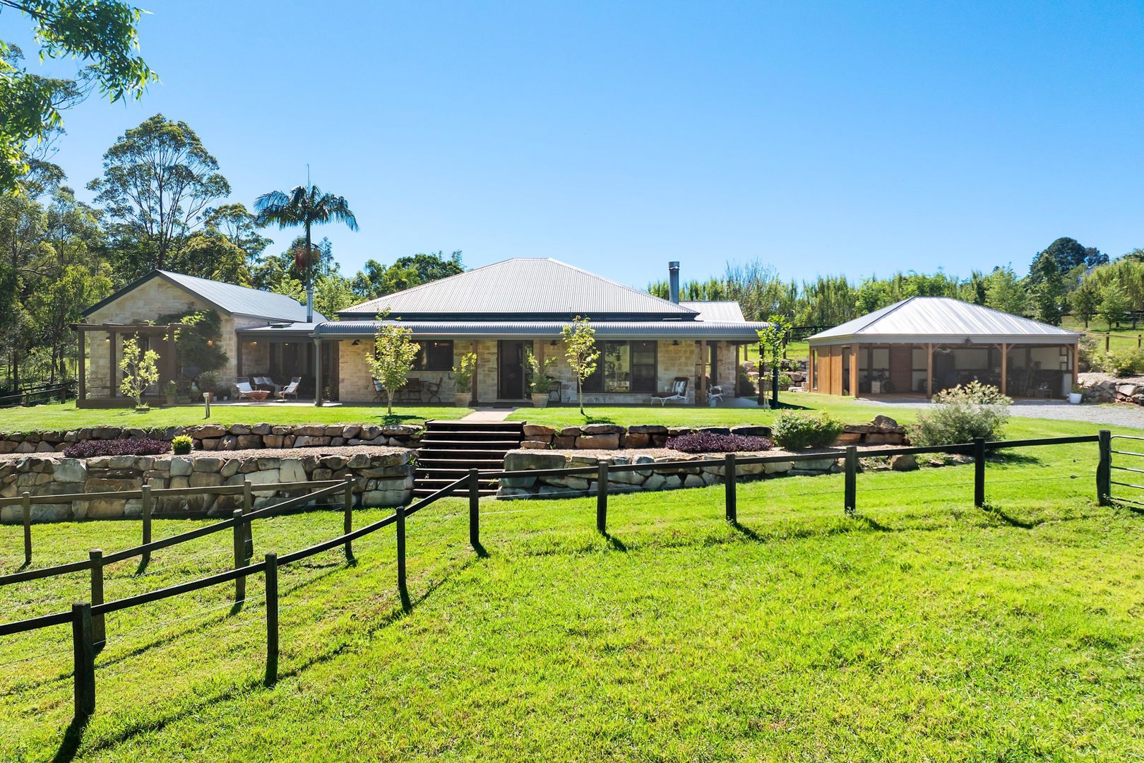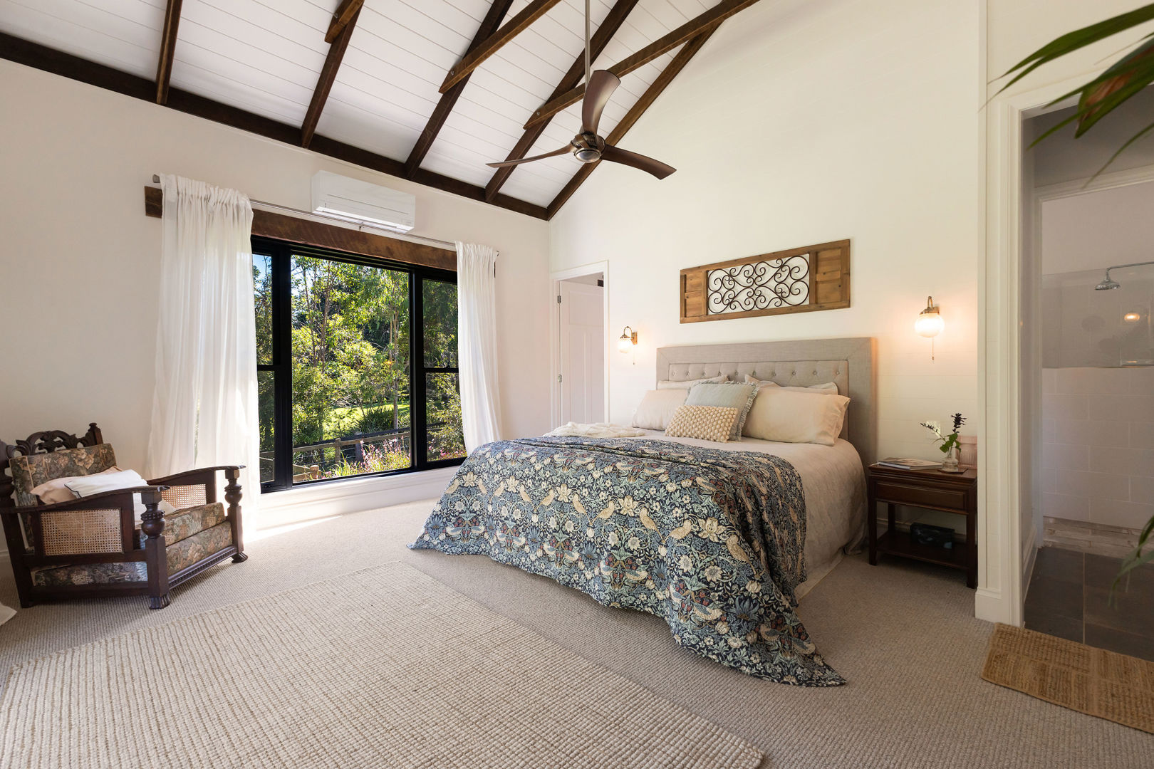 Accessed via a 270-metre driveway, the main residence is a contemporary interpretation of a classic Australian farmhouse. Constructed in 2023, with signature bullnose verandahs fringing the front and rear, it blends timeless design with relaxed liveability. Recycled timbers, hand-carved sandstone and wrought iron finishes lend warmth and character, while expansive windows and vaulted ceilings frame panoramic rural vistas and invite in abundant natural light. The home chef will also delight in the custom kitchen with stone benches, Smeg 900mm cooker and bespoke joinery, complemented by separate living and dining zones, each with cosy fireplaces. Additionally, enjoy three bedrooms and two bathrooms, including a master suite with dual walk-in robes, indulgent ensuite and direct access to an arboured deck with an idyllic outlook.