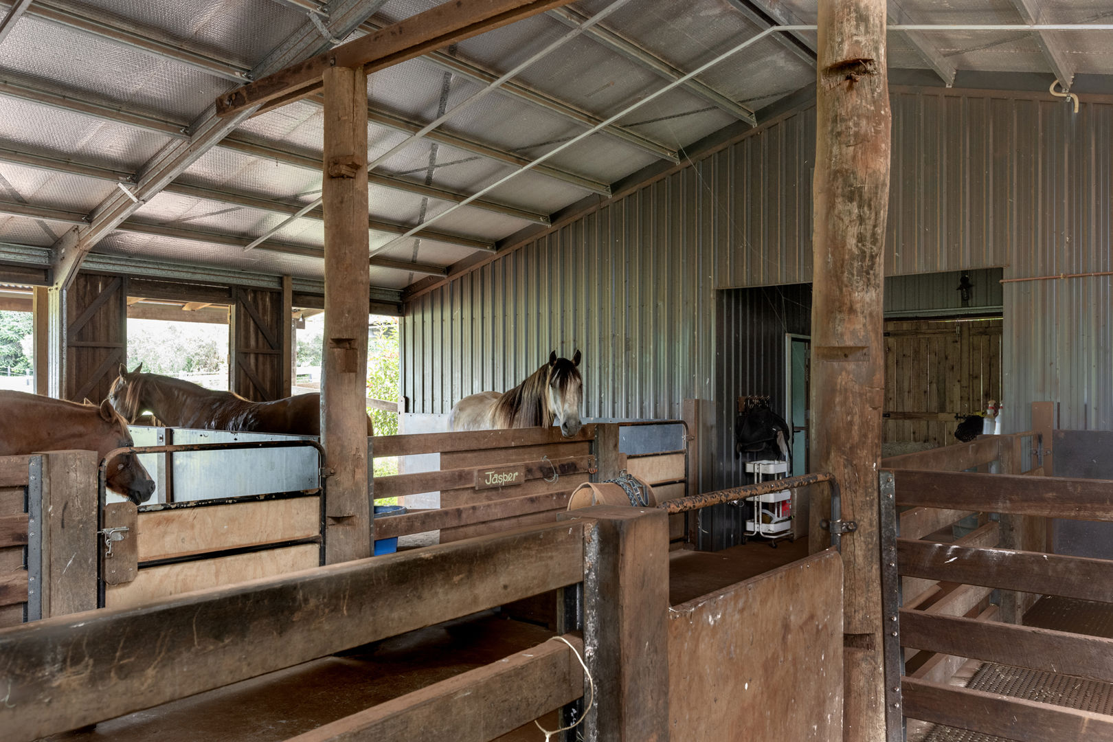 - Custom built steel-framed and recycled hardwood stables for four horses, with three phase power and water