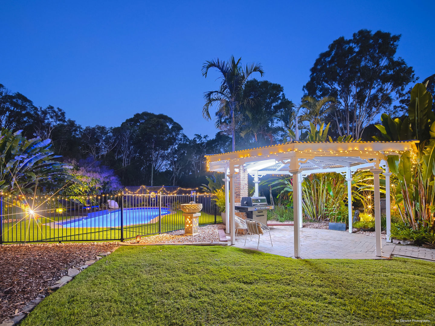 Step outside to a world of resort-style leisure - a sparkling 12-metre in-ground pool, gazebo, and BBQ pavilion set amongst lush lawns and tropical greenery. As evening falls, ambient lighting transforms the gardens into a private oasis, ideal for entertaining under the stars.