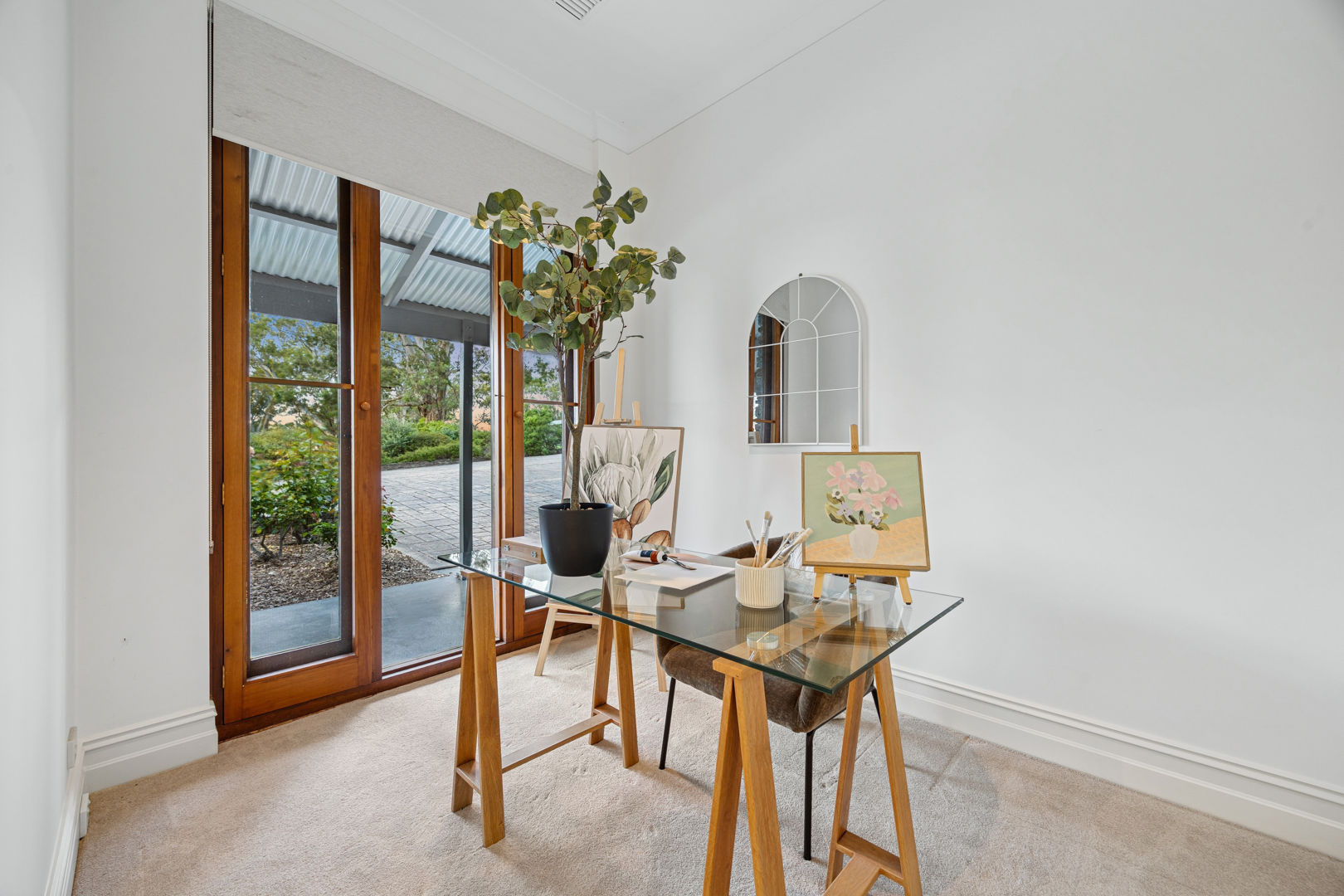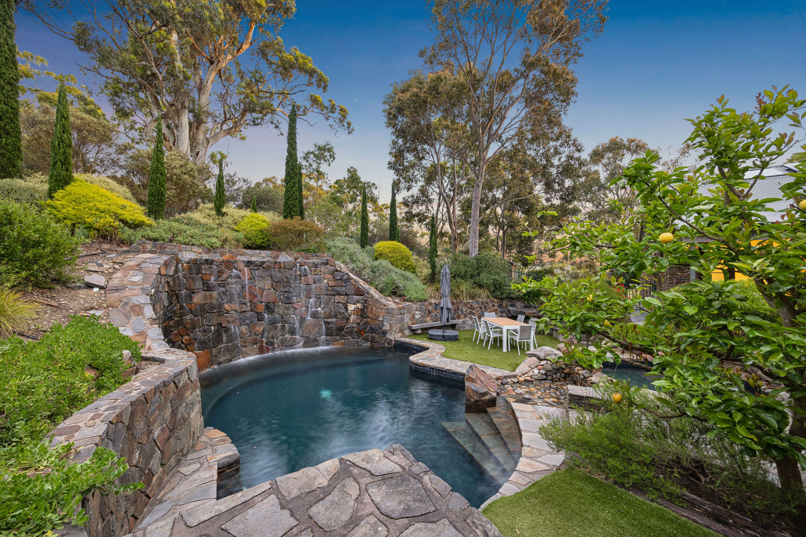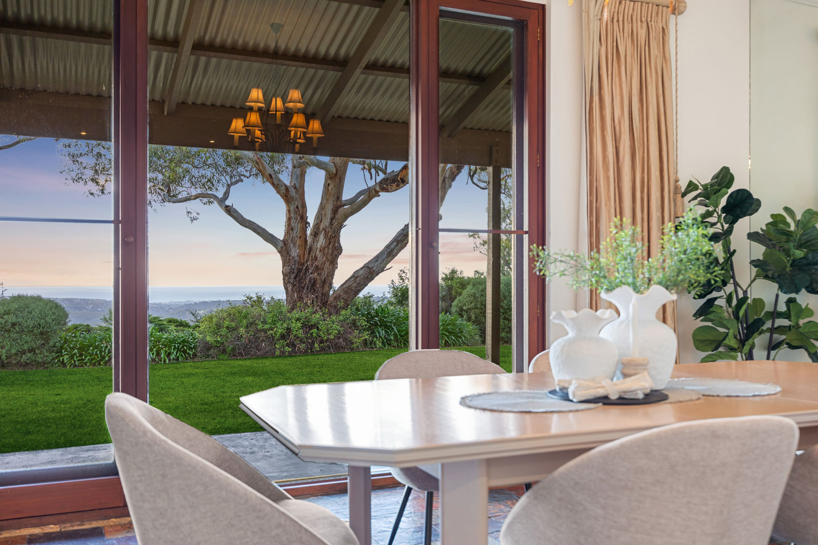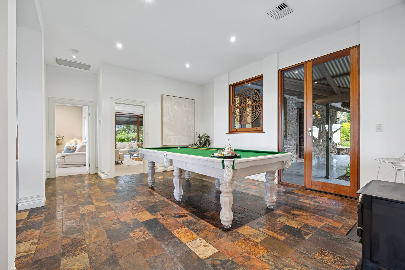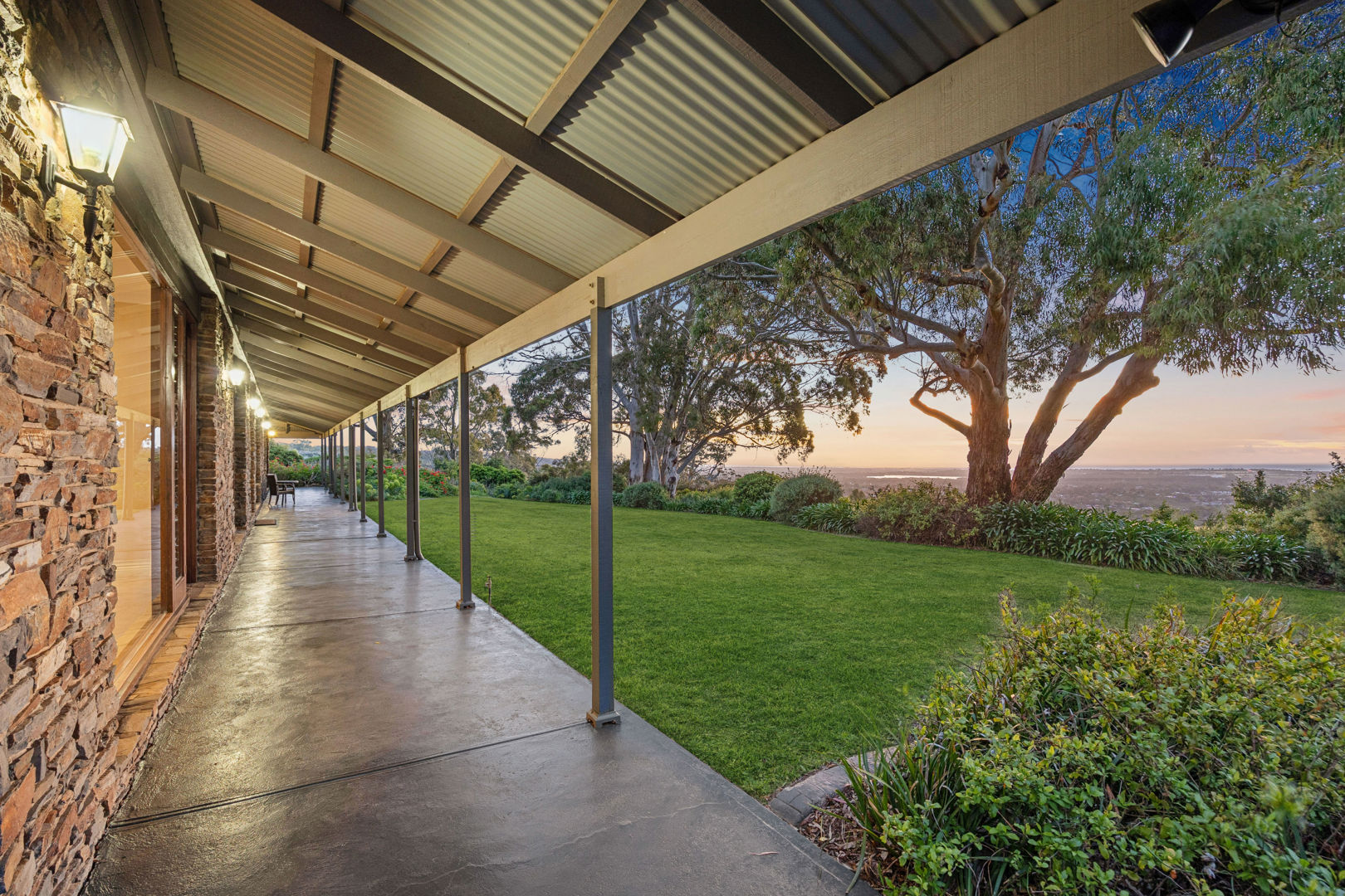 At the centre of this space lies a resort-inspired pool precinct - the ultimate setting for relaxation and entertaining. A cascading waterfall spills from an upper level into a smaller pool and spa below, surrounded by stone paving and shaded verandas that encircle the home. From here, sweeping views stretch from the rolling hills to the glittering coastline between Happy Valley and Glenelg - a breath-taking backdrop for every moment, from tranquil mornings to evenings shared under the stars.