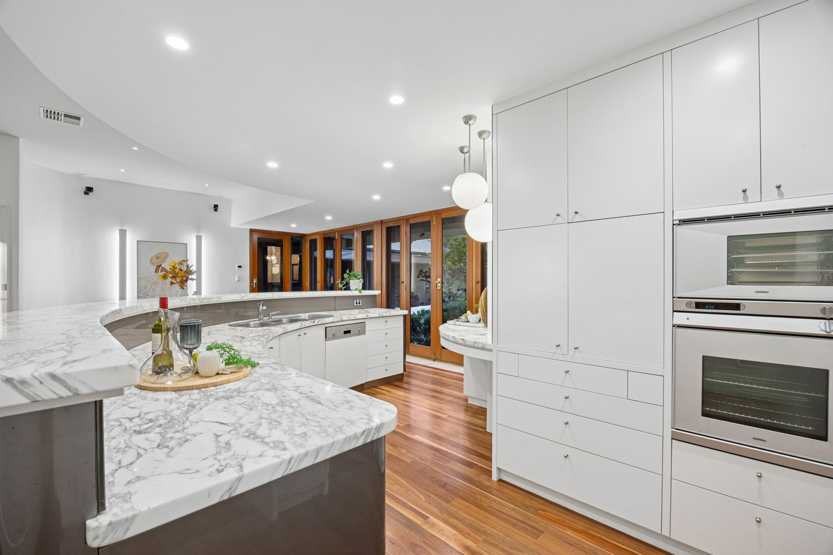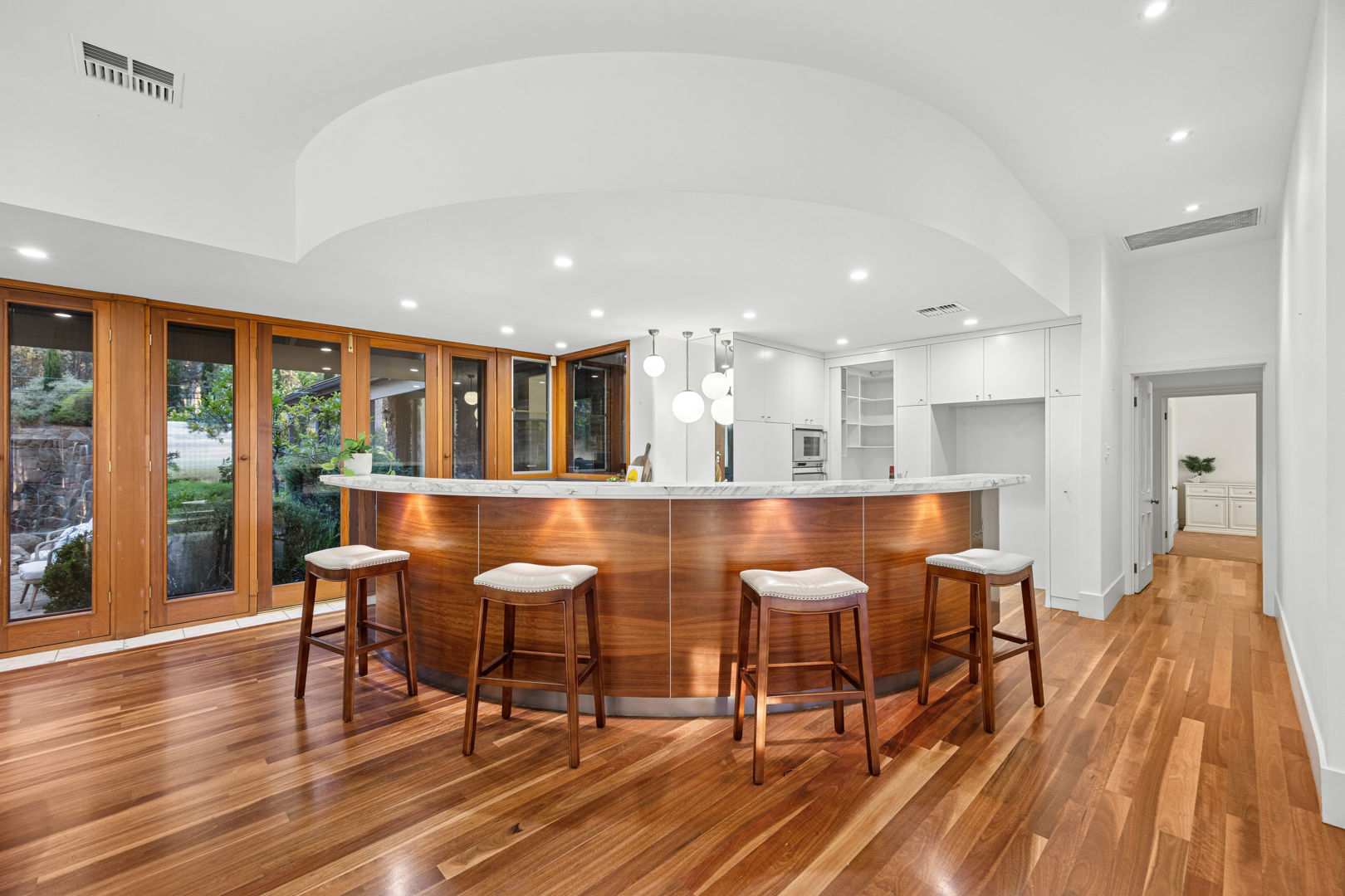 Inside, generous proportions and refined finishes create an atmosphere of timeless elegance. Across five distinct living areas, there's space to relax, gather and entertain - from the formal lounge and media room to the billiard room and open-plan family zones featuring beautiful Blackbutt and Spotted Gum flooring, a Bose sound system, and a stunning entertainer's kitchen with white marble benchtops, Gaggenau appliances and a walk-in pantry abundant with storage.