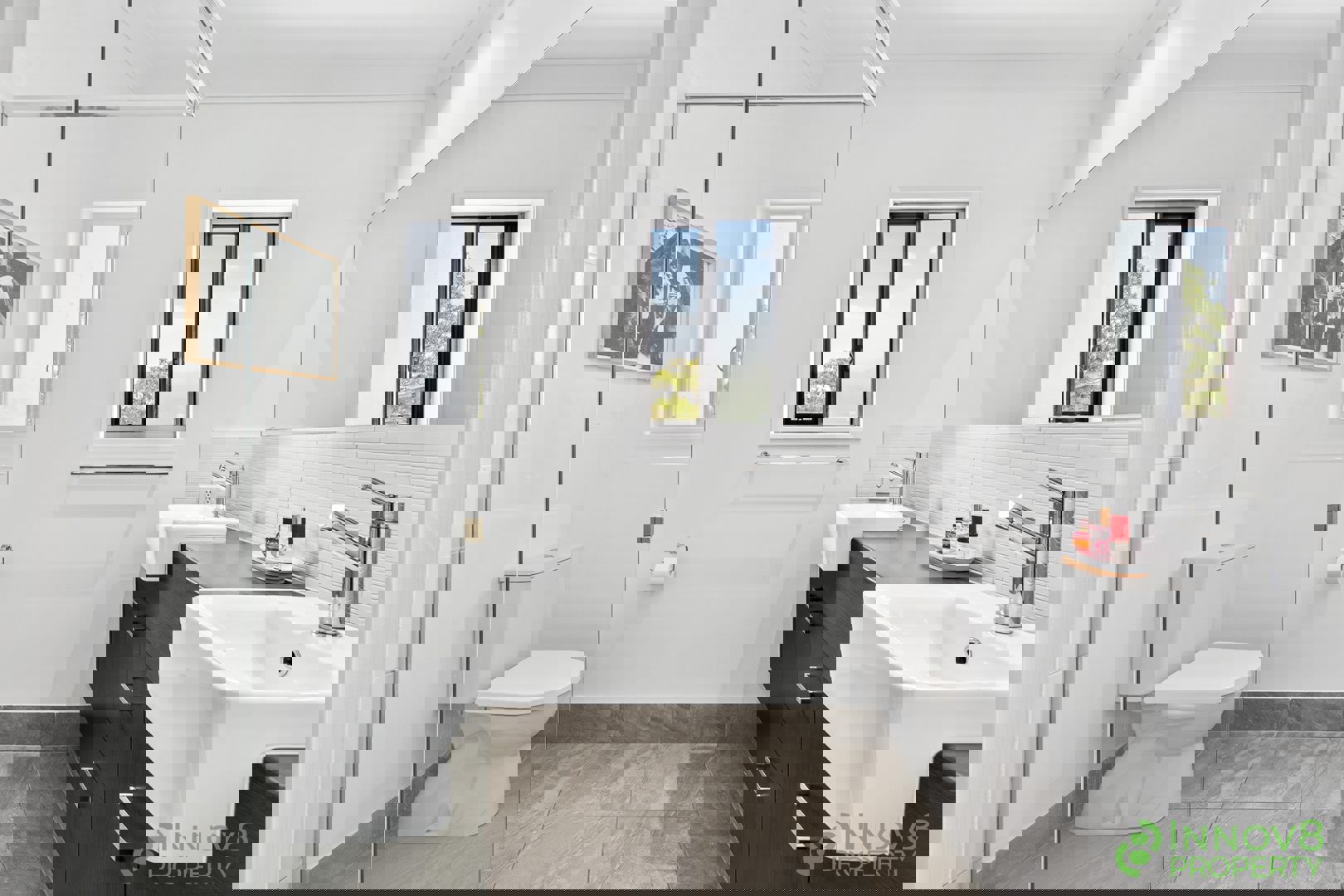 Immediately on the left, you’ll find the well-designed and air-conditioned master bedroom with block-out blinds, a ceiling fan, a generous walk-in robe and a gorgeous ensuite that includes a shower with a shelving niche, twin vanities and a heat lamp…but best of all, you’ll love the superb leafy aspect out the large windows that produces a wonderfully scenic and relaxing aura as you ponder the distant natural bushland (you might even catch a glimpse of a wandering wallaby or a sleeping koala.