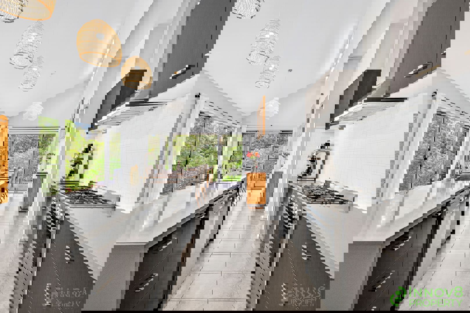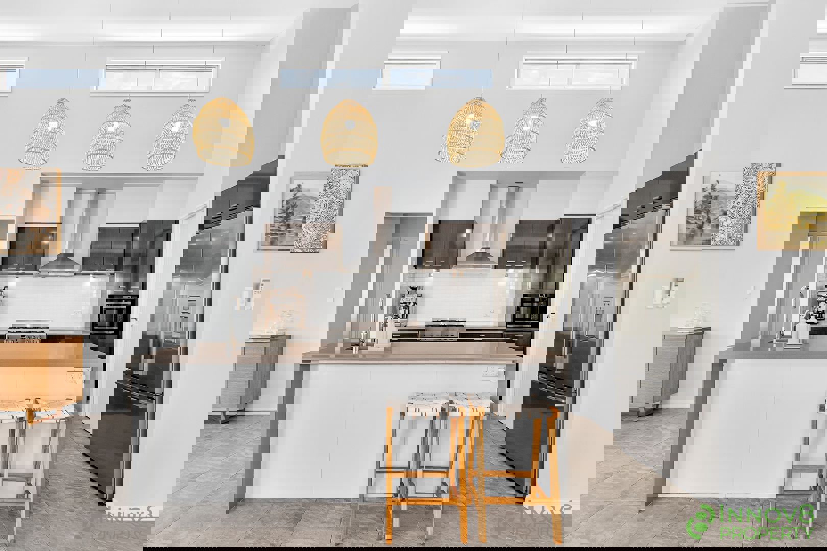 • Stunning kitchen with 40mm stone bench tops, recessed sinks, room for a double door fridge with plumbing, a large walk-in pantry, beautiful pendent lights, a chic tiled splash back and a selection of quality stainless steel appliances
