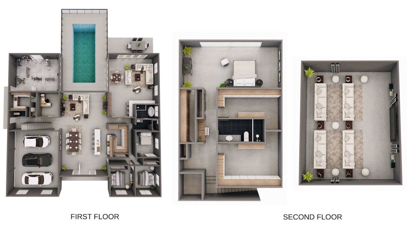 At the heart of the home, a sculptural Cheminee fireplace provides warmth and presence, anchoring the central open-plan living space. The layout follows a clever H-shape, offering natural division between shared and private zones.