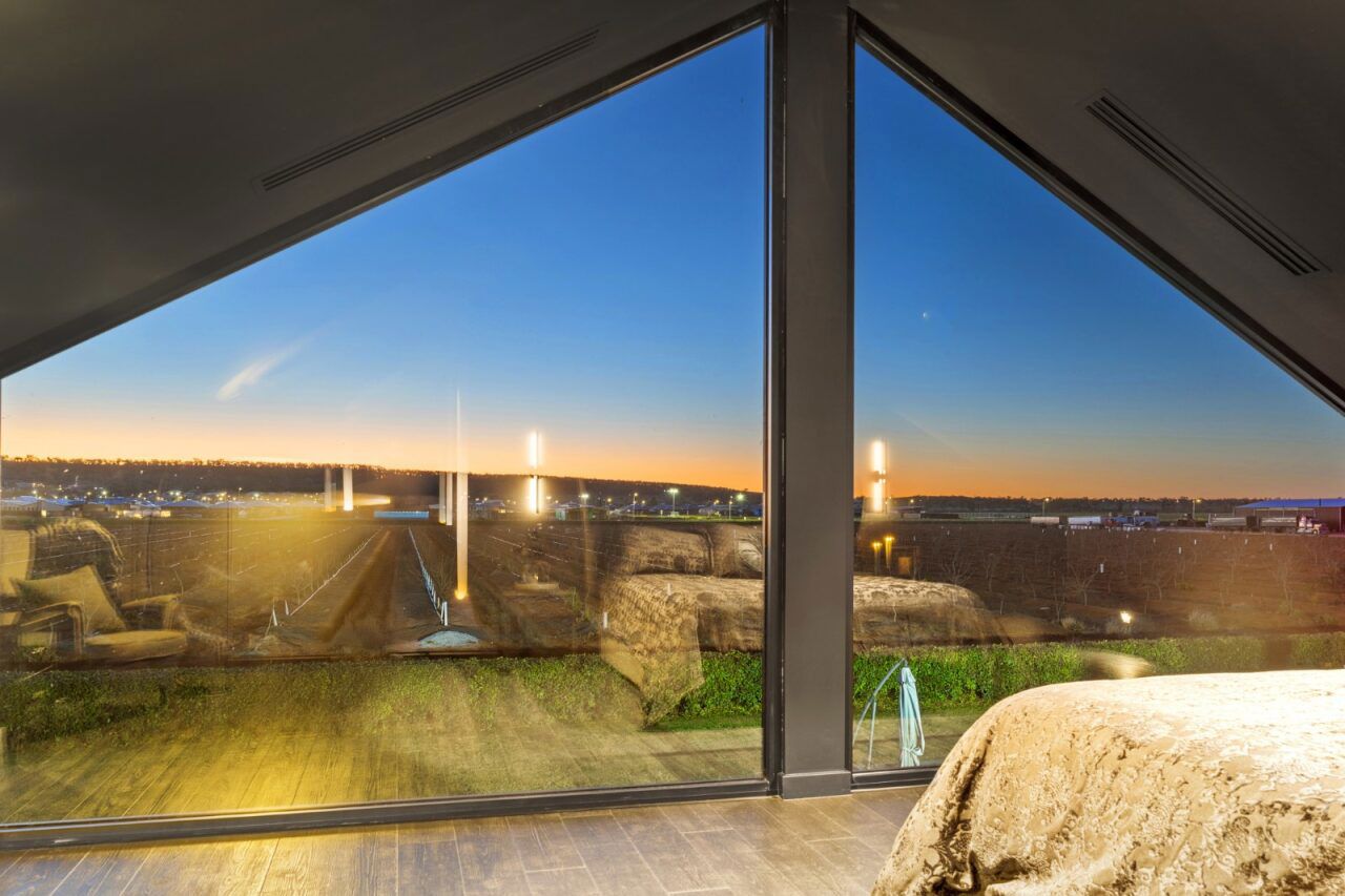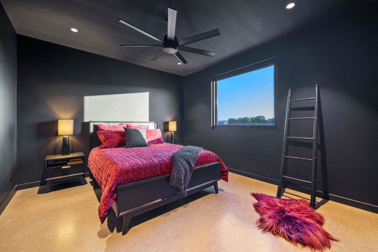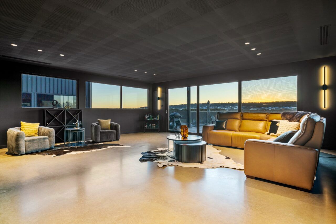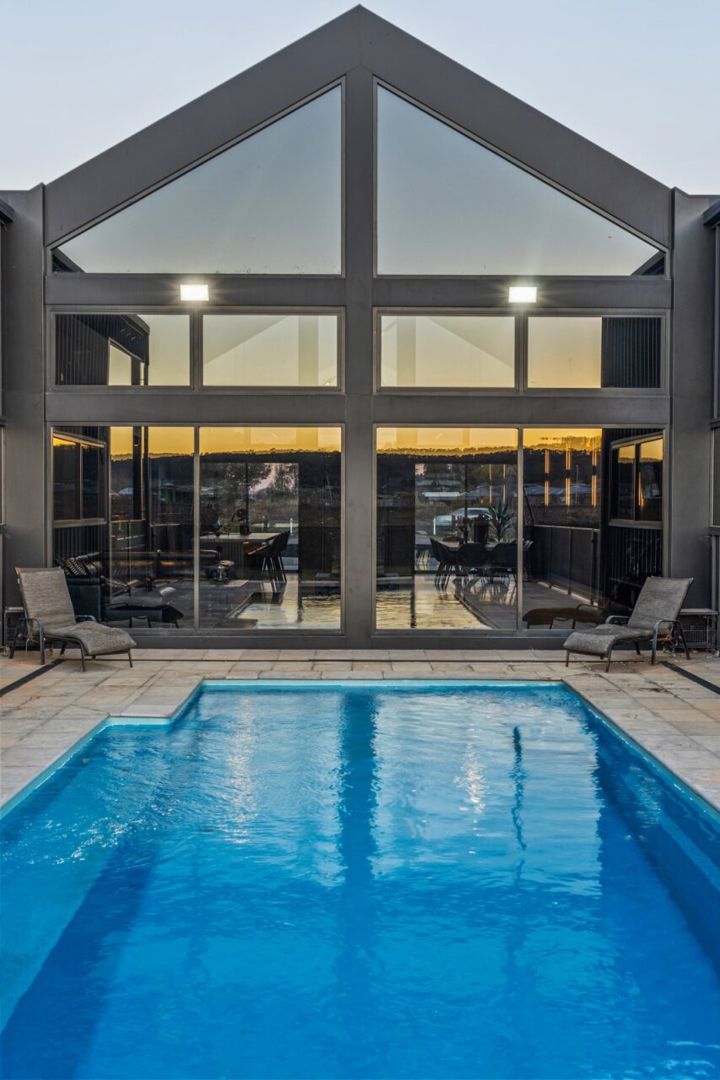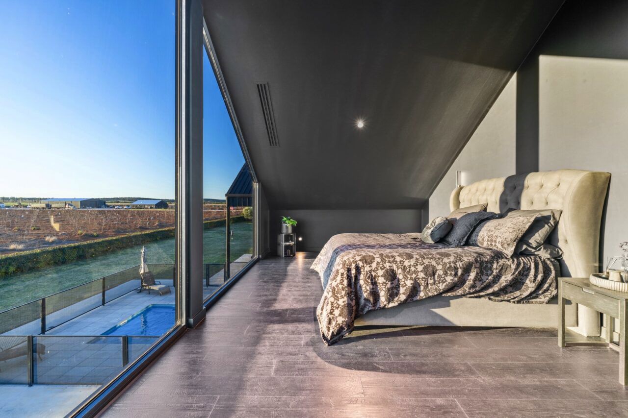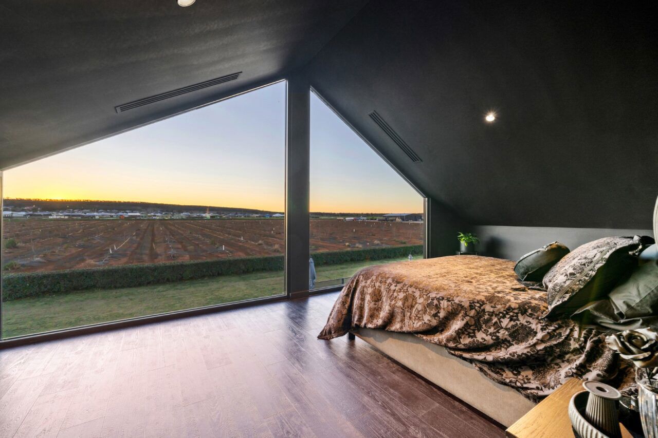 On one side, a separate wing accommodates guests or family. On the other, a generous master suite features dual dressing rooms, a luxurious skylit ensuite, and a bedroom designed to take in the distant glow of Griffith's night lights through its striking triangular window.
