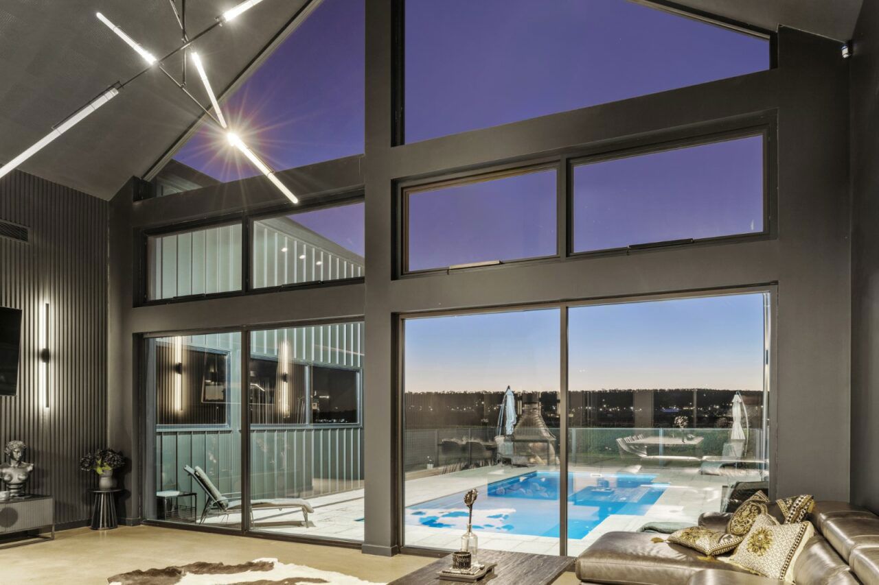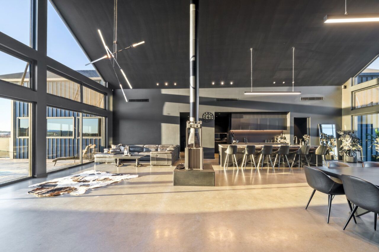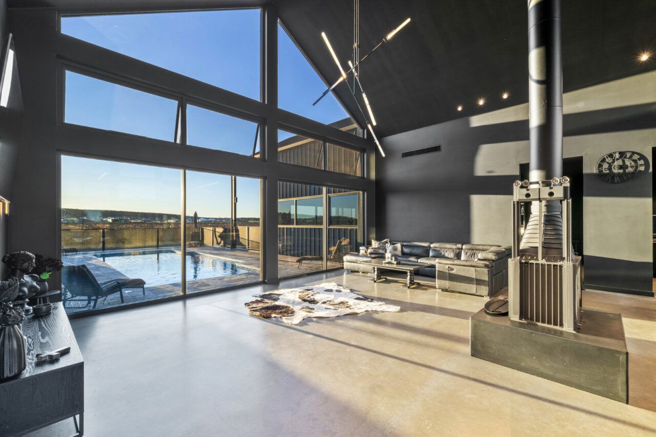 As you step through the custom Zen pivot door, you're welcomed into a space that opens with command, 8-metre cathedral ceilings, clean lines, and floor-to-ceiling glass that draws in natural light throughout the day.