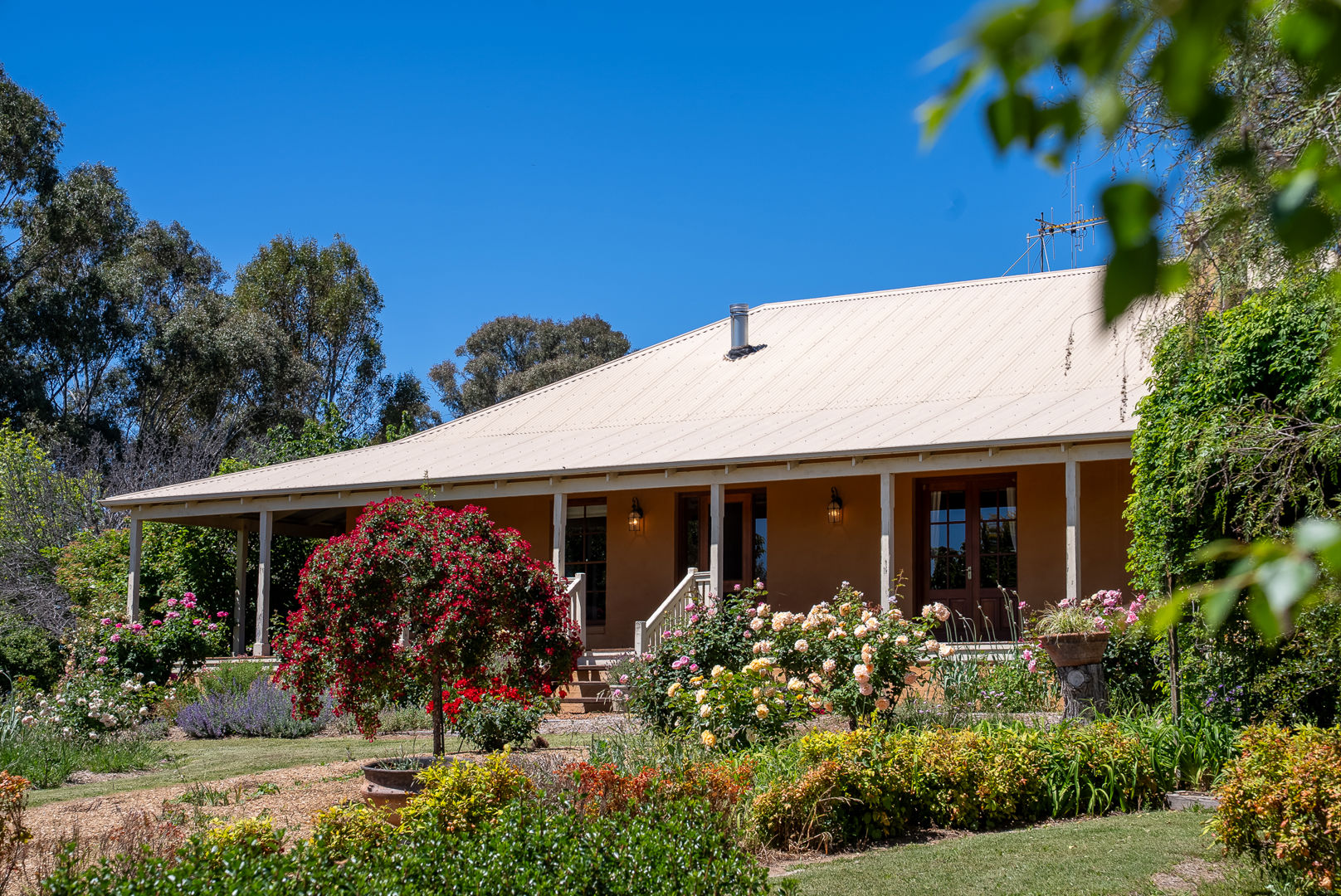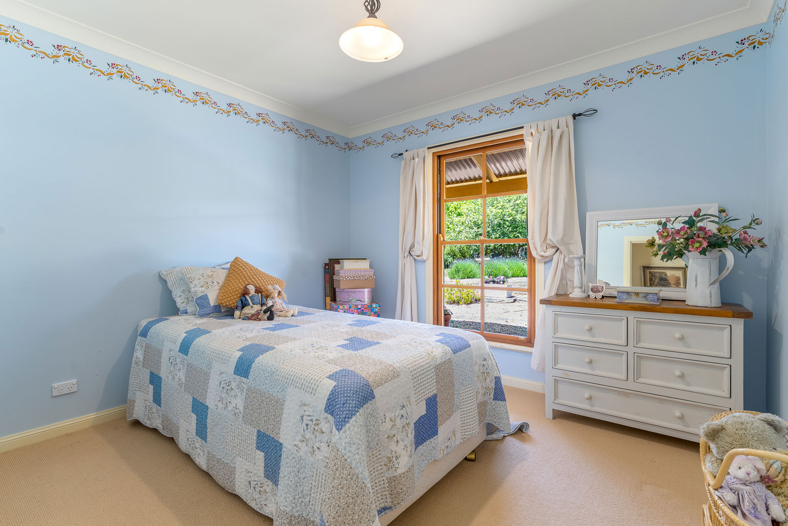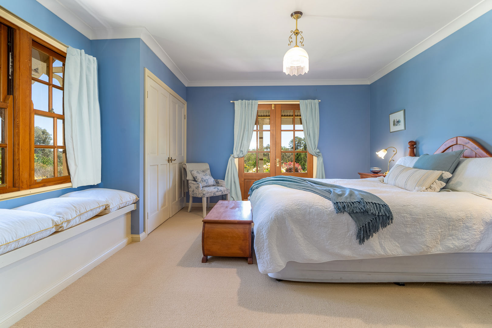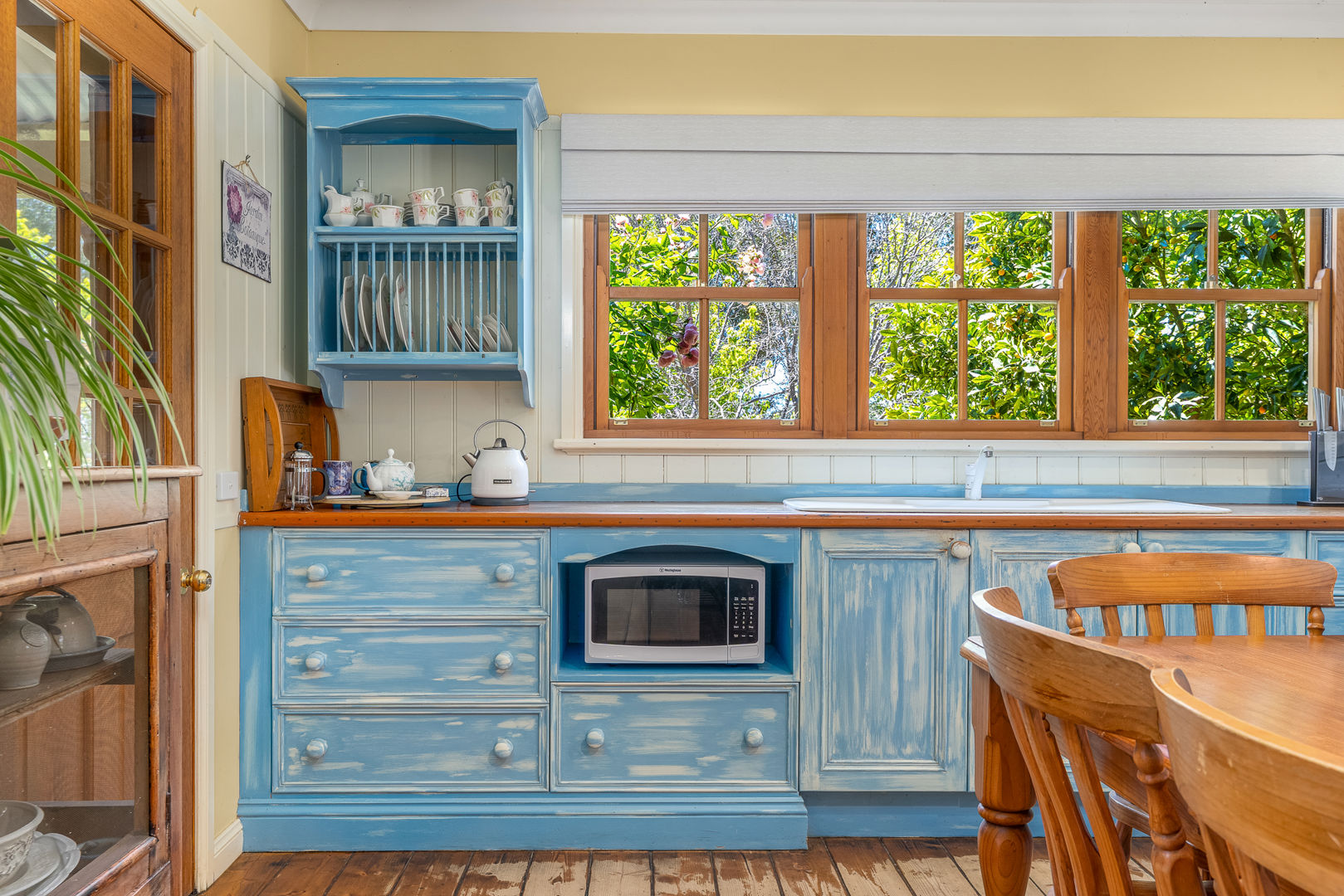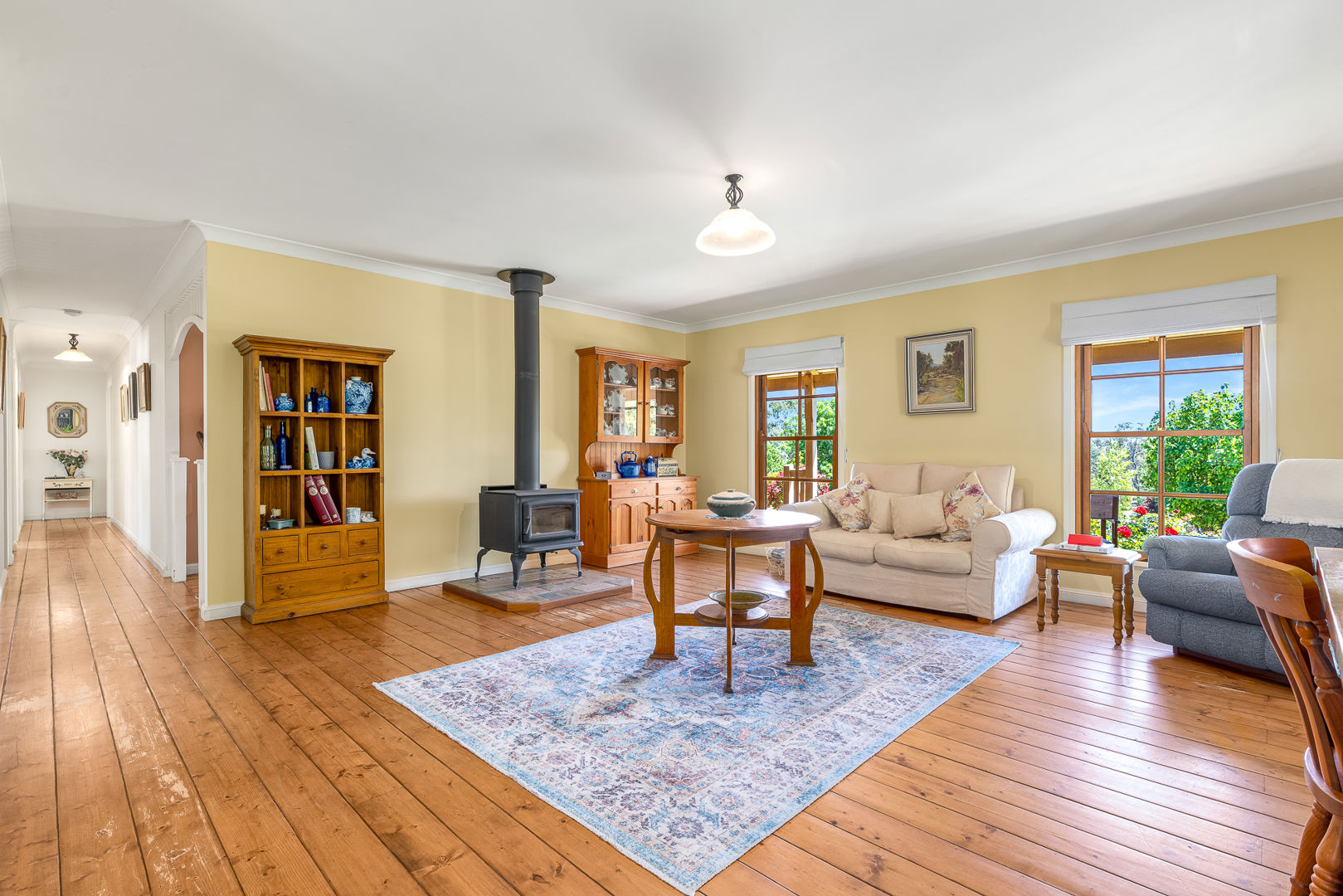 The country cottage-style home is rich in character, featuring beautiful pine flooring, stained timber windows, and elegant French doors that open onto a wide verandah - the perfect place to soak in the tranquil outlook over the gardens.