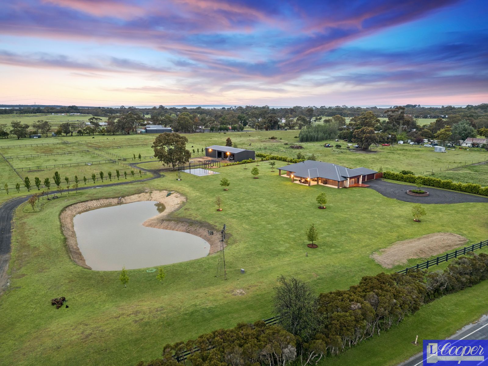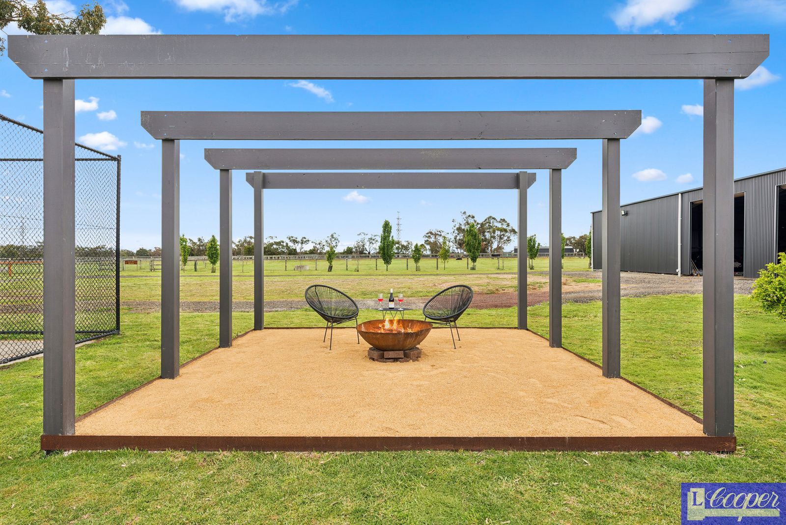 Shed 26m L x 12m D front with 3 phase to shed switchboard possibility to make as Stables. 3 Roller doors are electric and have LED high bay lights.
