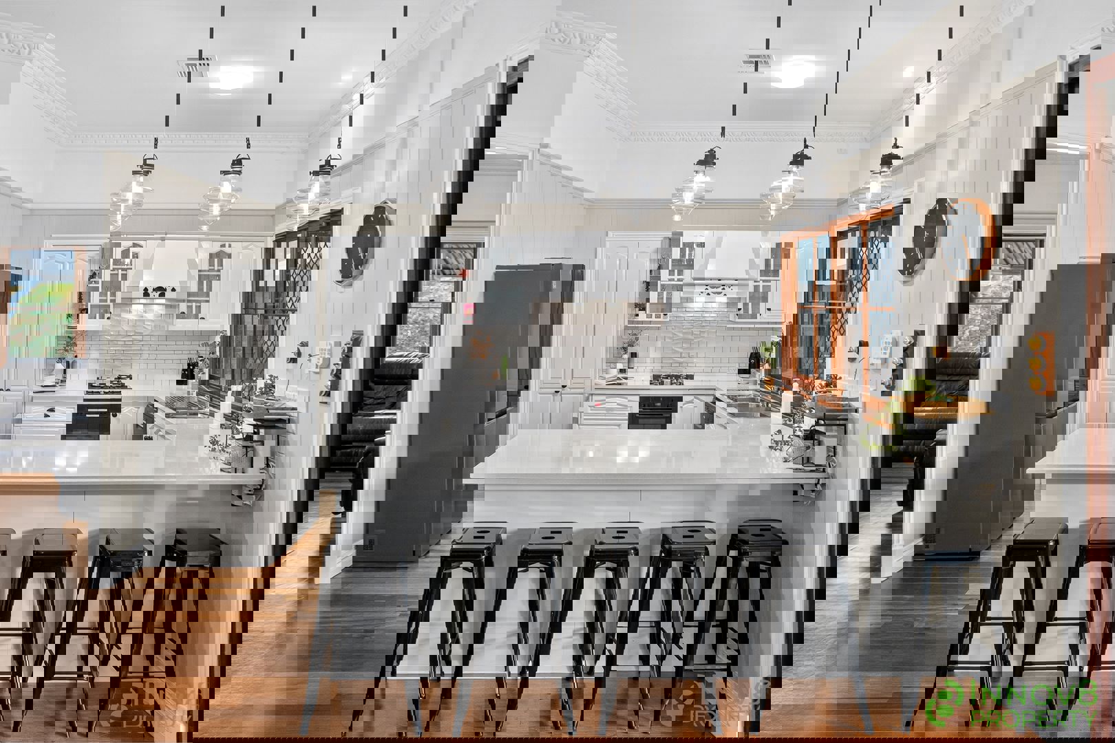 There’s a fantastic central dining area that adjoins the stunning renovated kitchen that features 30mm stone bench tops, smooth 2-Pac cabinetry, beautiful pendent lights, a huge walk-in pantry with a coffee station, a lovely feature tiled splash back, room for a double door fridge and a selection of brand new Bosch stainless steel appliances that includes a gas cook top, oven, dishwasher and range hood.