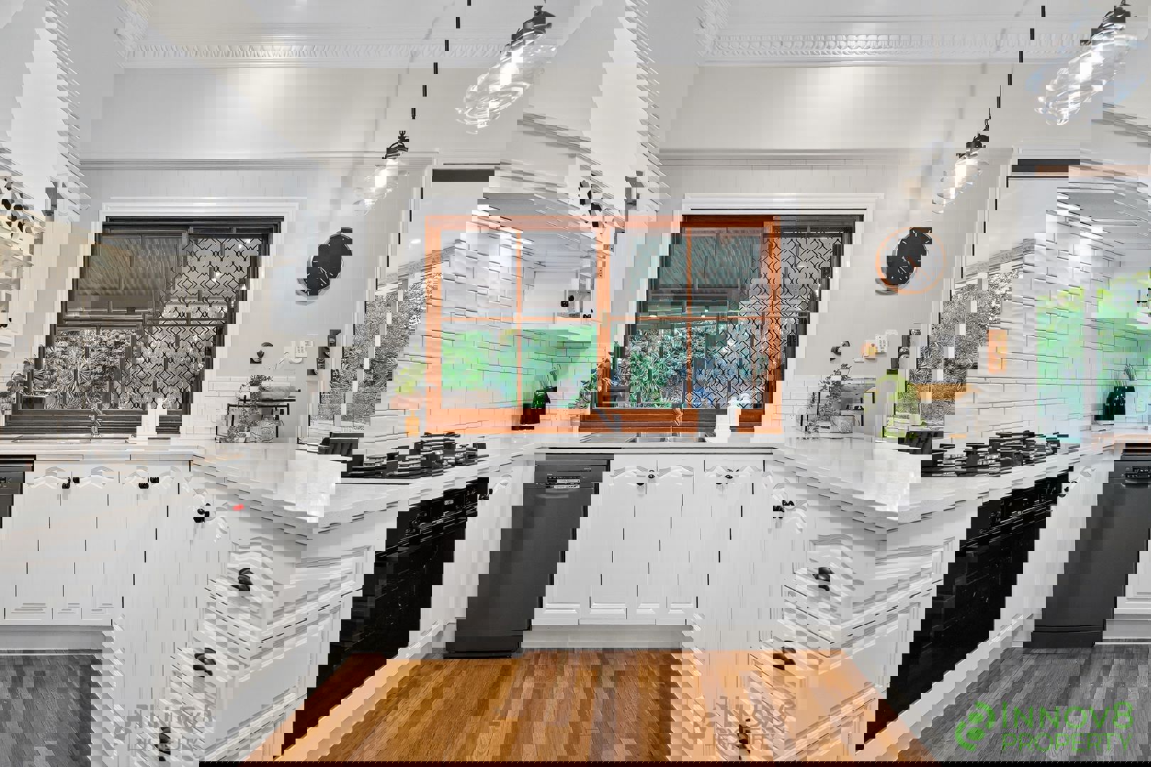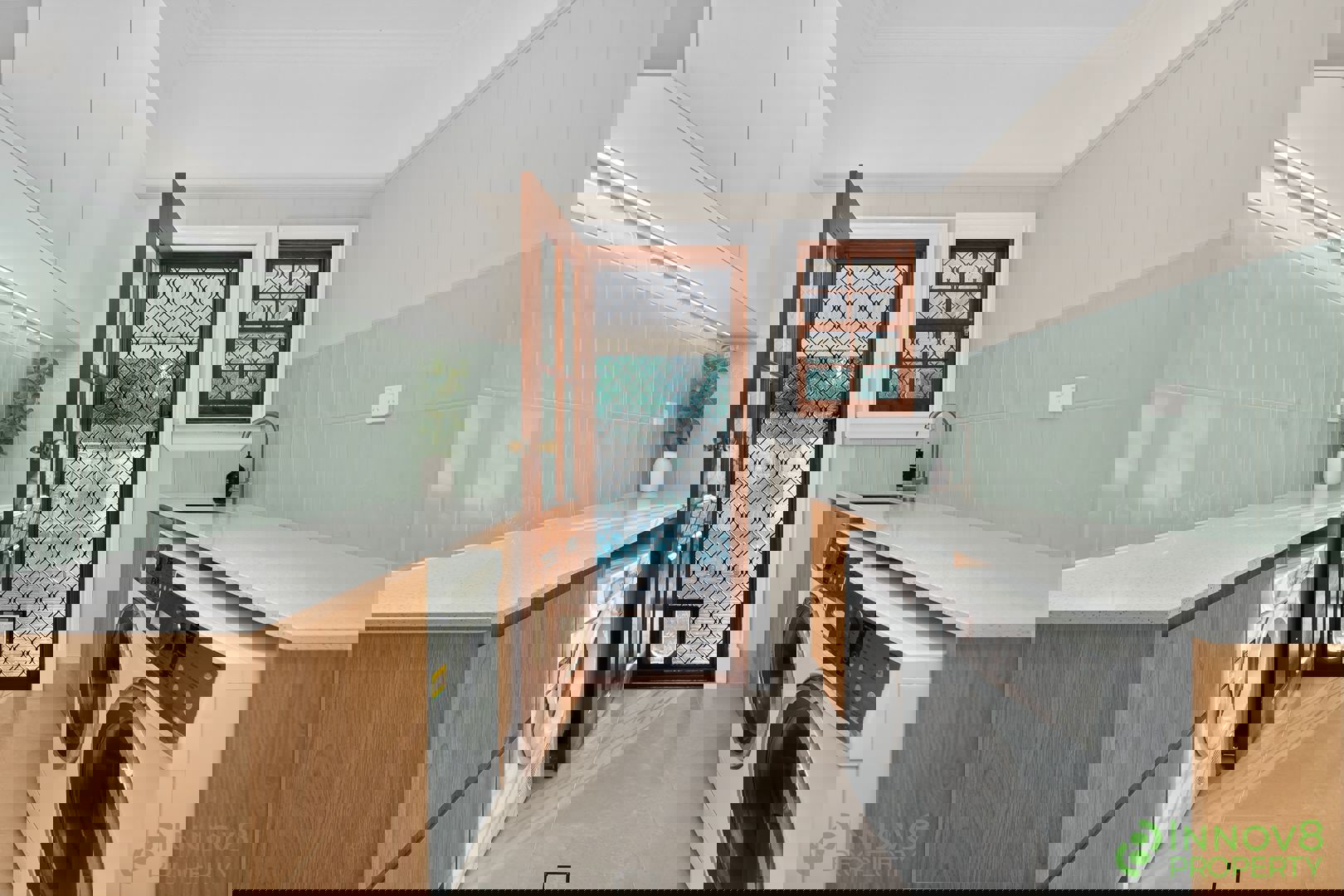 • Stunning renovated kitchen that features 30mm stone bench tops, smooth 2-Pac cabinetry, beautiful pendent lights, a huge walk-in pantry with a coffee station, a lovely feature tiled splash back, room for a double door fridge and a selection of brand-new Bosch stainless steel appliances