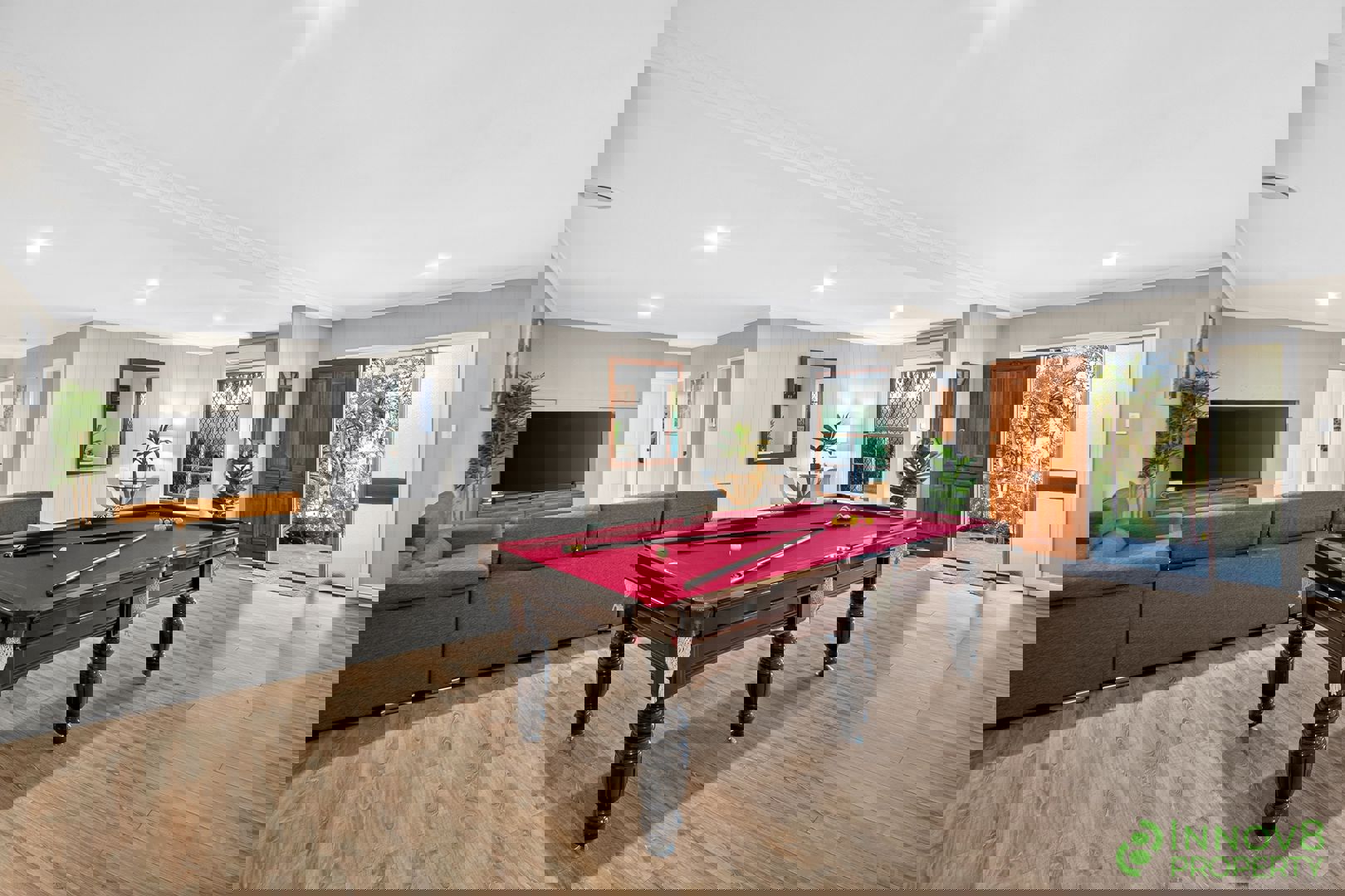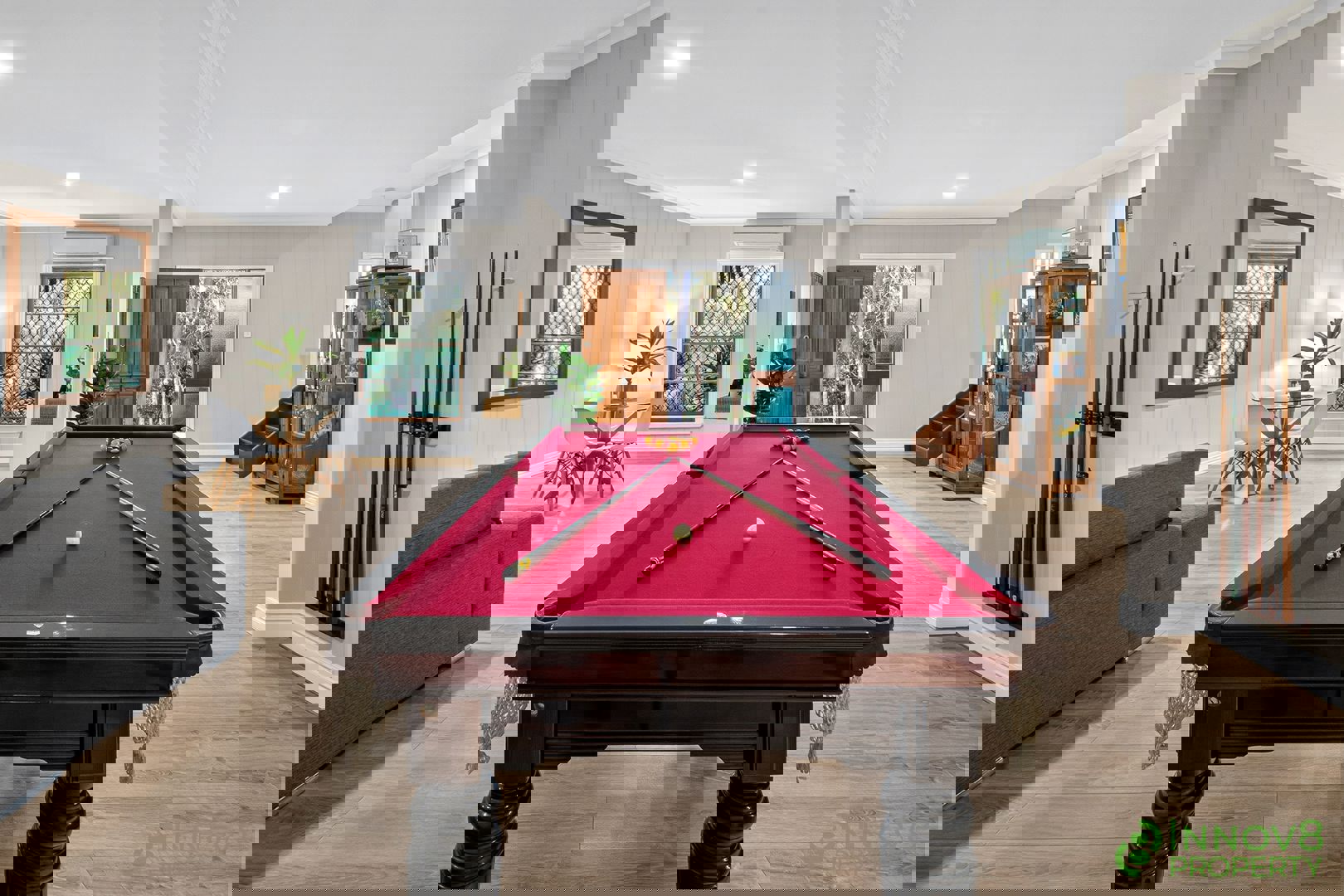 If you head to the right of the downstairs entry, you’ll find the enormous open plan rumpus room that’s clearly large enough to house a pool table and is complete with new laminate flooring, air-conditioning, gorgeous VJ wall panelling, a selection of double-hung windows and French doors and most notably, a fantastic bar area with loads of cupboards that could easily be converted into a full kitchen for a complete ‘dual living’ option downstairs.