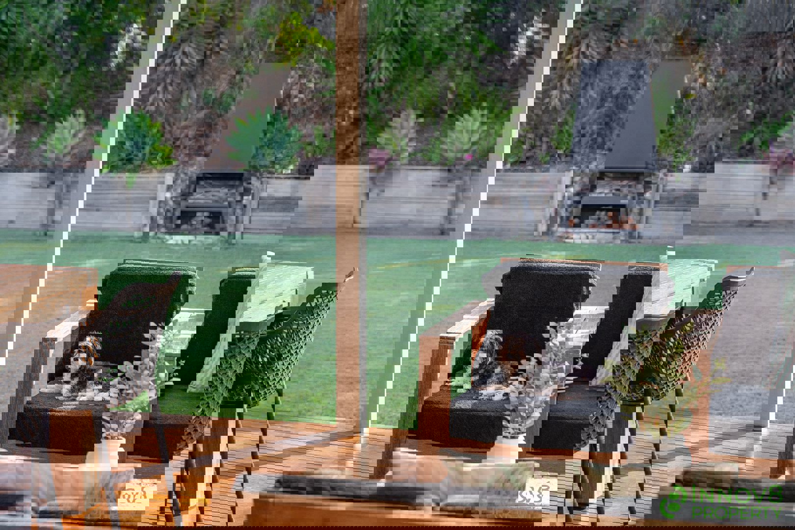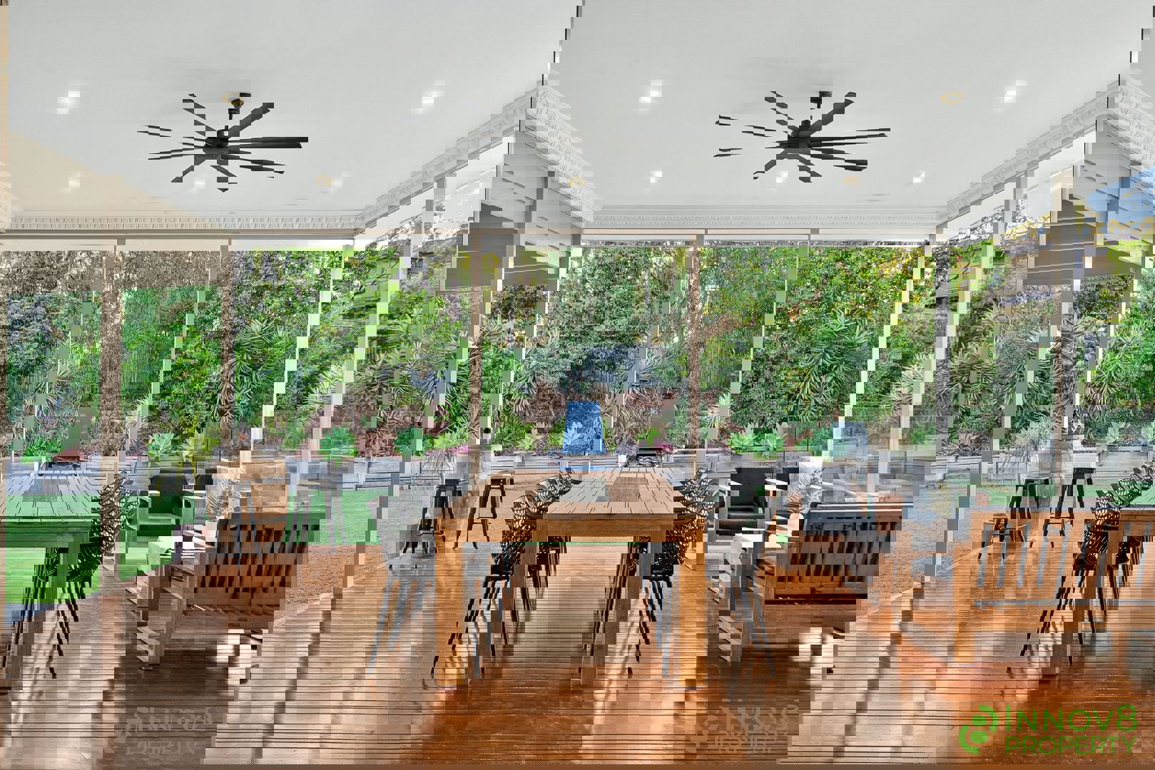 This wonderfully adorned outdoor space flows effortlessly into the expansive grassy and flat backyard.