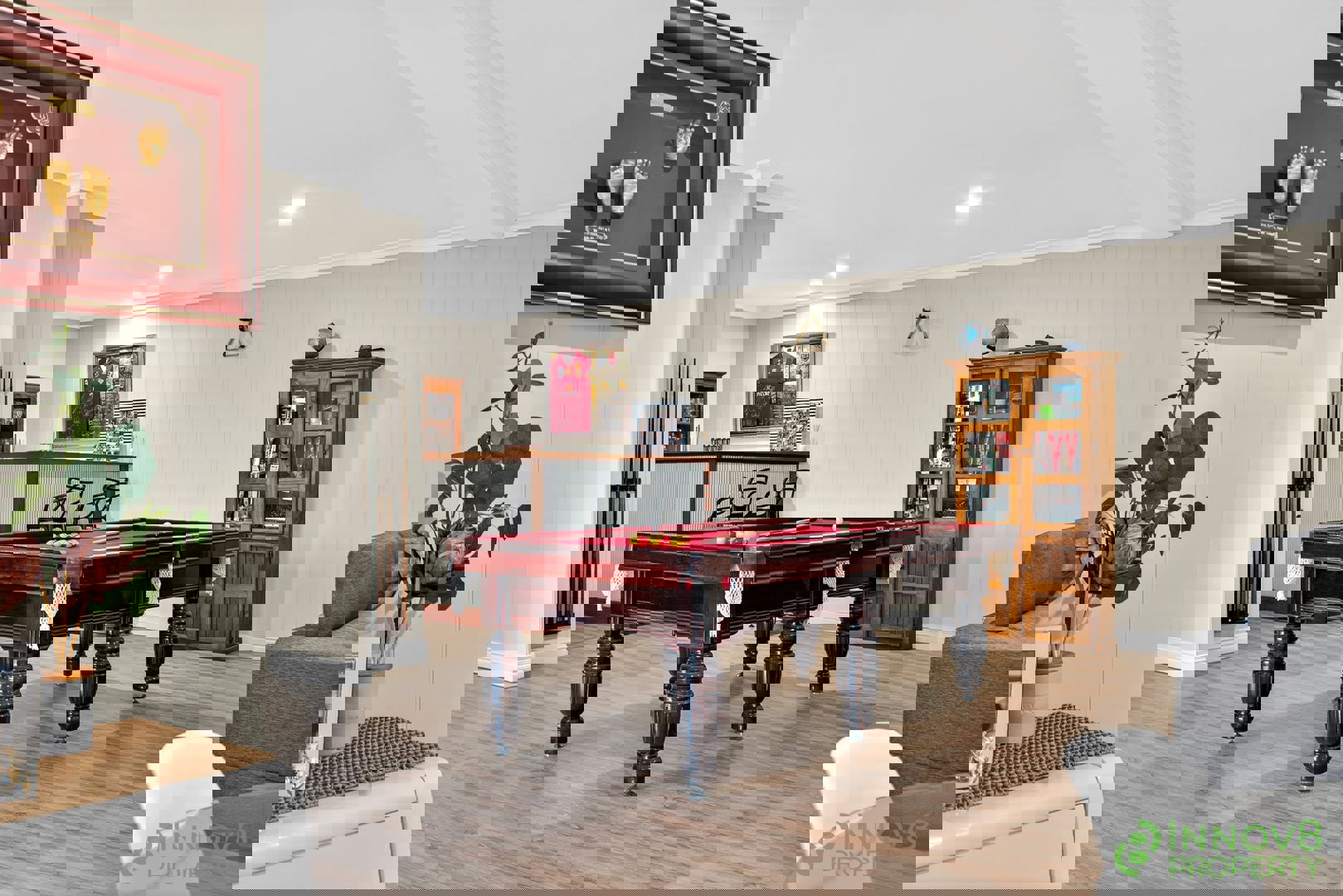 • Enormous open plan rumpus room that’s clearly large enough to house a pool table and is complete with new laminate flooring, air-conditioning, gorgeous VJ wall panelling, a selection of double-hung windows and French doors and most notably, a fantastic bar area with loads of cupboards that could easily be converted into a full kitchen for a complete ‘dual living’ option downstairs