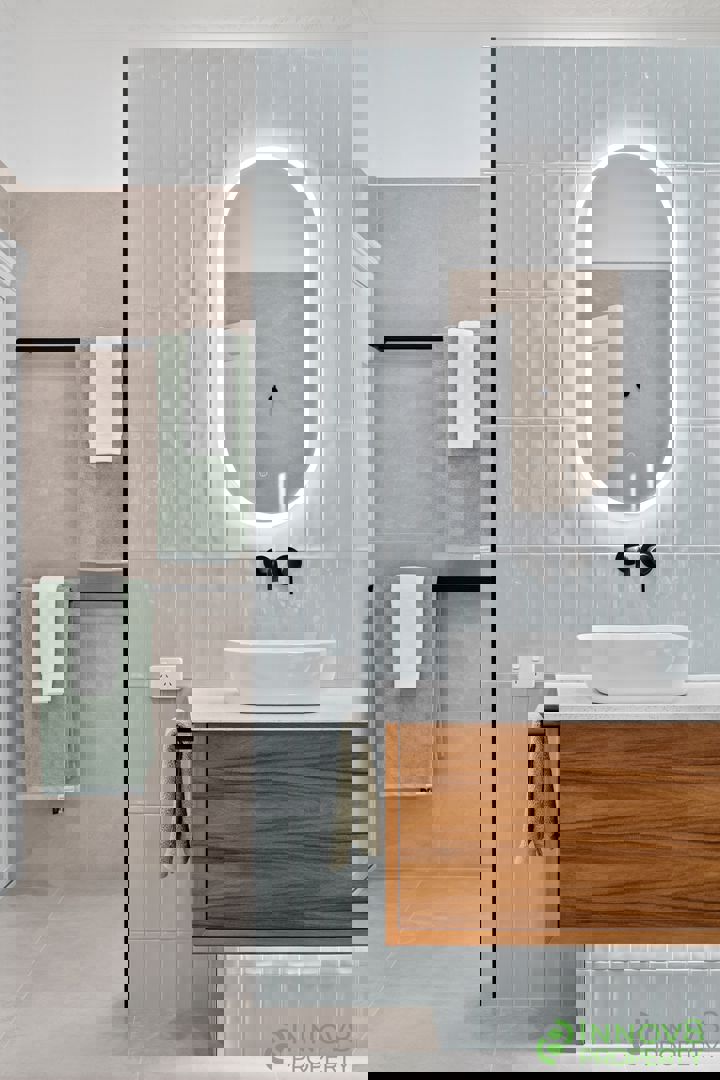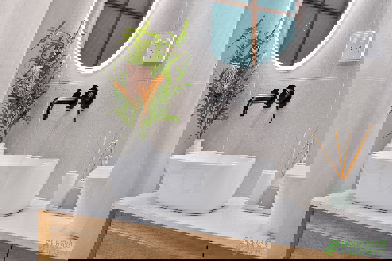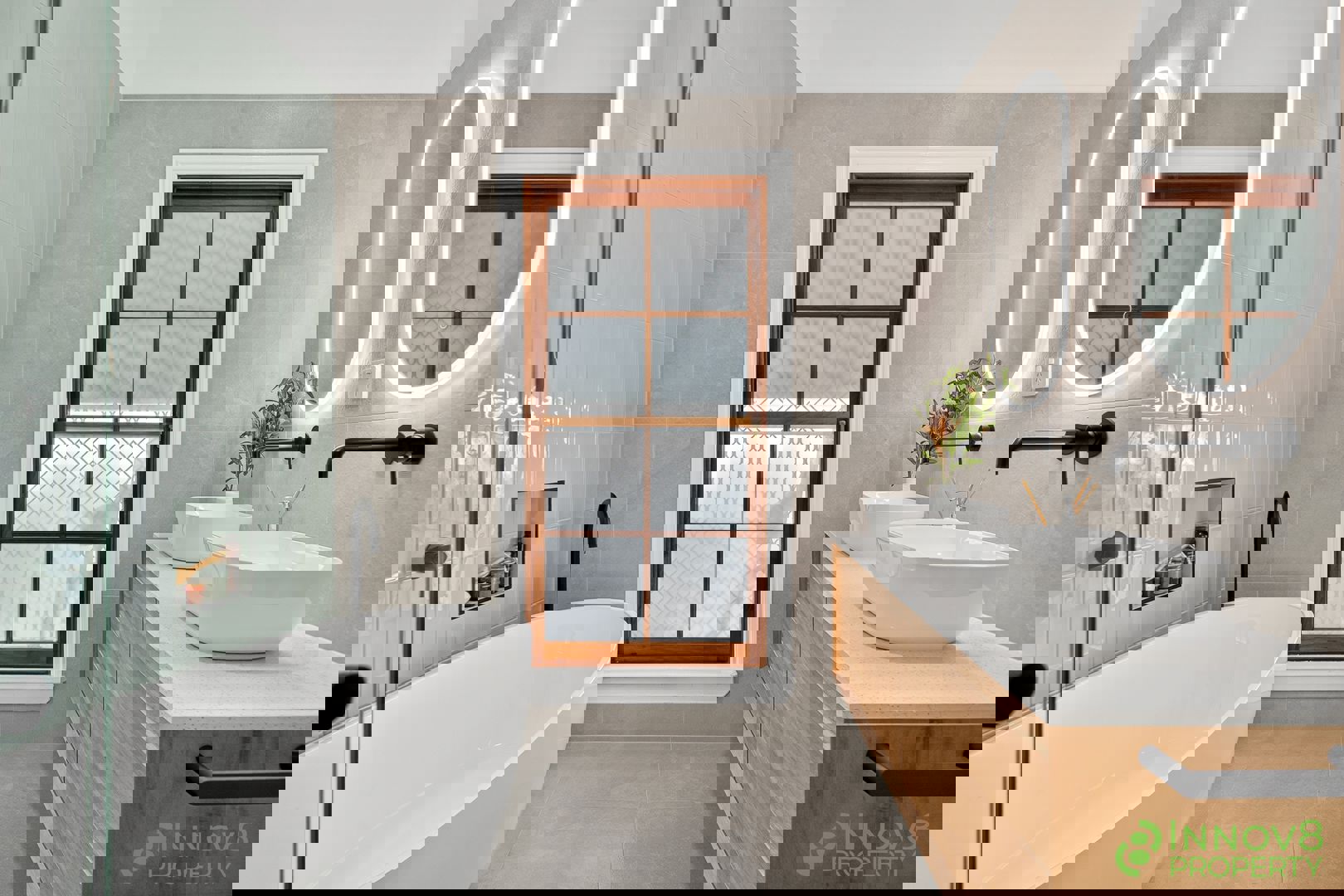 • Freshly renovated main bathroom that offers a free-standing separate bath, a separate shower with shelving niches, and black fittings, dual stone topped vanity basins and more twin back-lit mirrors – sheer luxury from every angle