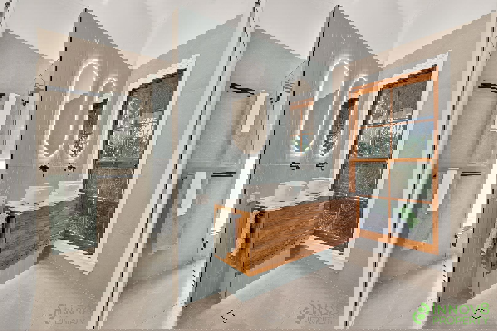• Palatial master bedroom with yet another split air-conditioner and ceiling fan, French doors that open to the front deck, a large built-in robe and a truly breath-taking brand new renovated ensuite that features chic floor-to-ceiling tiles, a semi-open double shower with oversized heads, a double vanity with a feature-tiled wall and twin back-lit mirrors, a toilet and another huge bank of cupboards