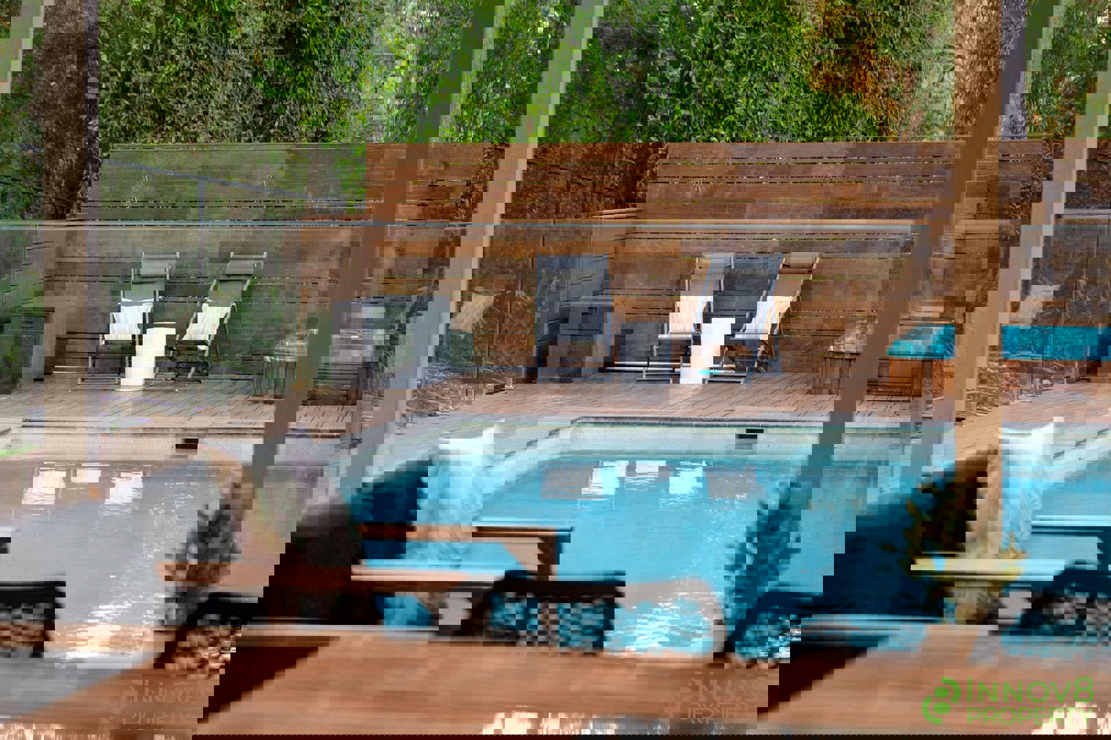 • Sparkling in-ground salt-water swimming pool with heating, surrounding timber decking and fabulous glass balustrading