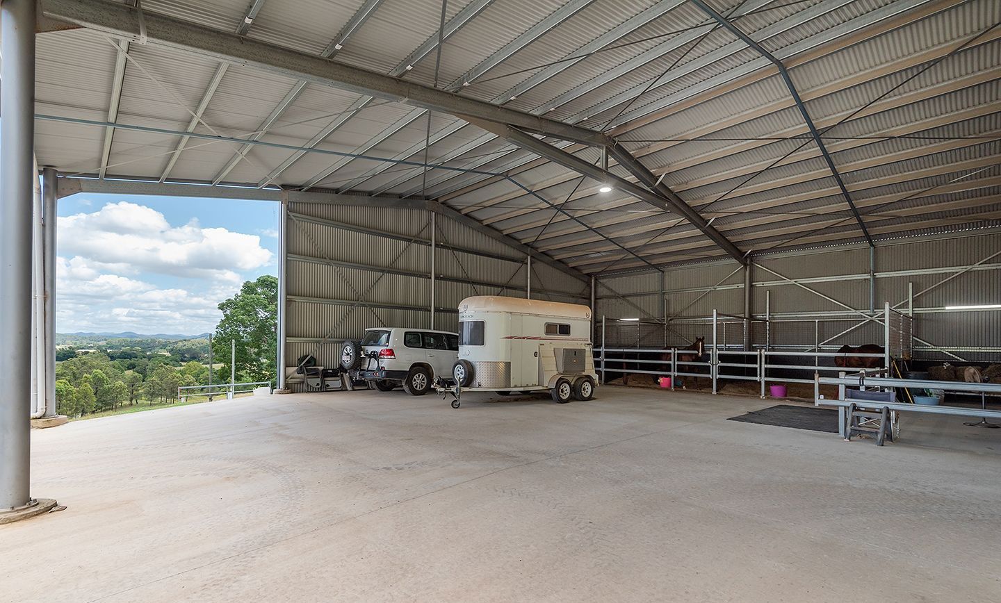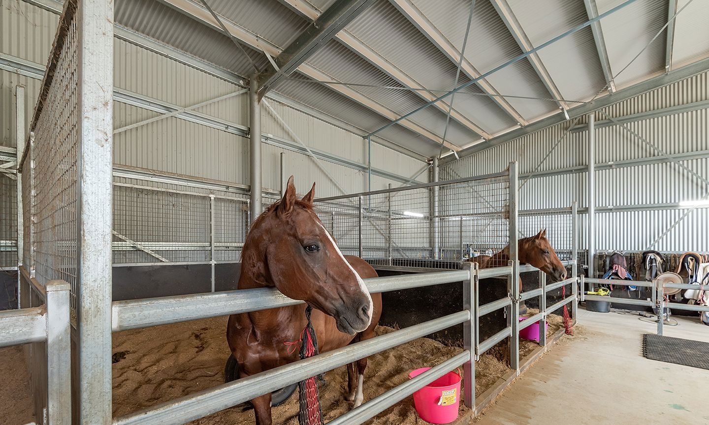 The infrastructure on the property is as impressive as the residence: with new internal equine mesh fencing (also dog secure), 3 x paddocks, remote controlled entry gate, security cameras, 4 x rainwater tanks, solar powered bore, 60x20m full sized irrigated sand arena (partially covered for all-weather use), 3 x box stables, open tack room with concrete floor, 6x6m powered and air-conditioned shed/office (near house and wired for internet), and 4-bay powered shed with toilet and basin.