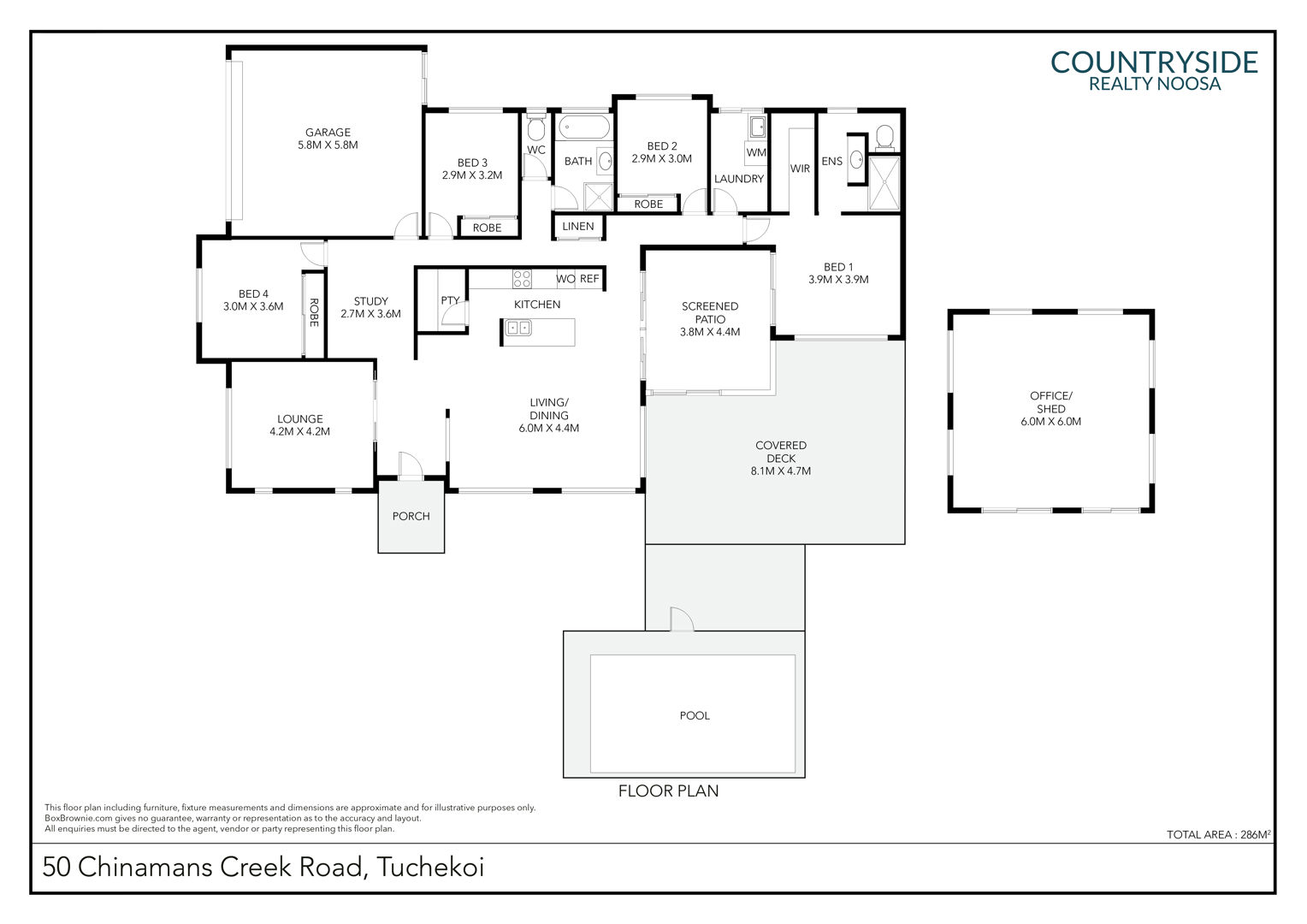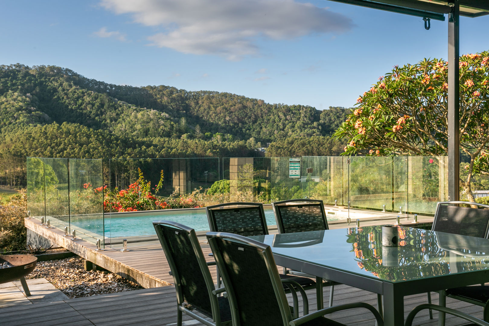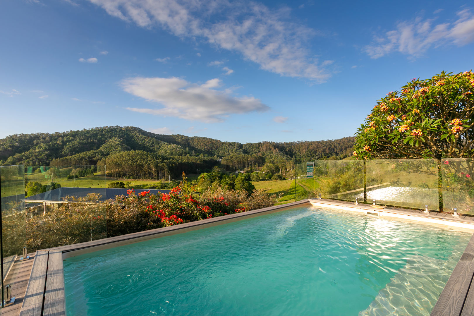 The residence itself is perfectly positioned towards the rear of the property to maximise elevation, outlook, privacy, and light; and across a single level, it comprises four bedrooms, two bathrooms, study, separate living areas including screened indoor/outdoor room, galley kitchen, north/north-west facing covered terrace to savour the verdant vista and magical sunsets poolside, separate laundry, and double lock-up garage.