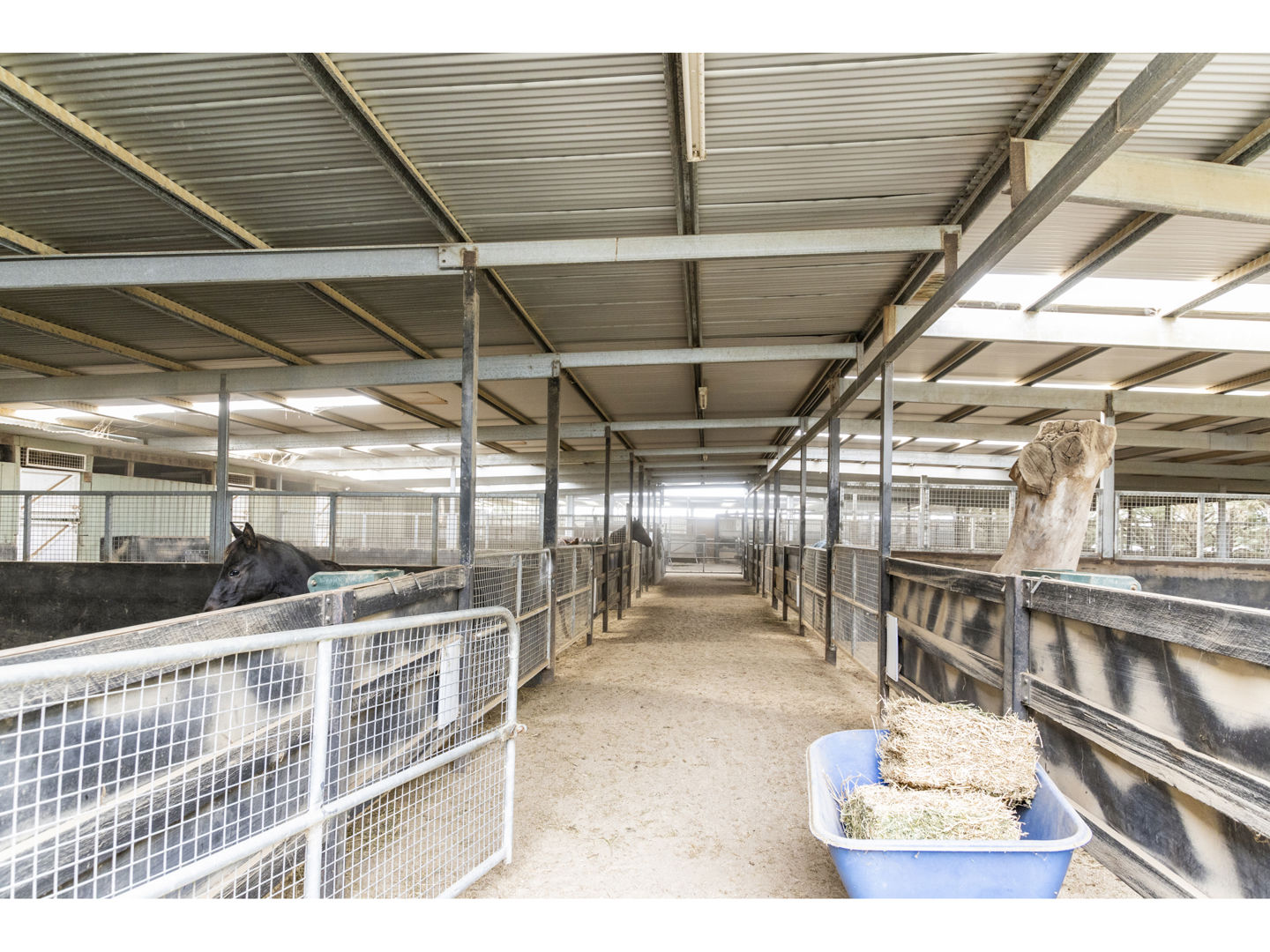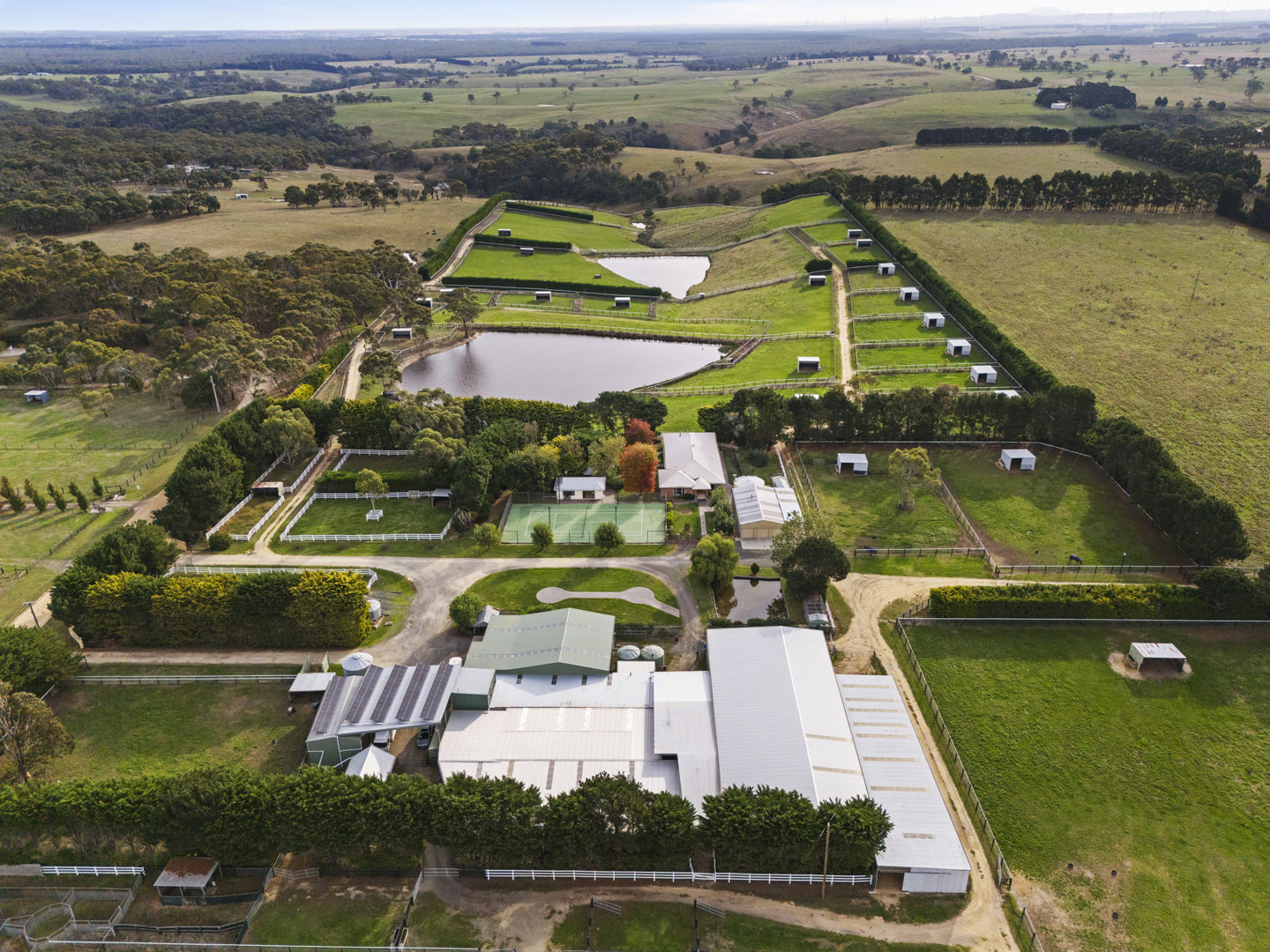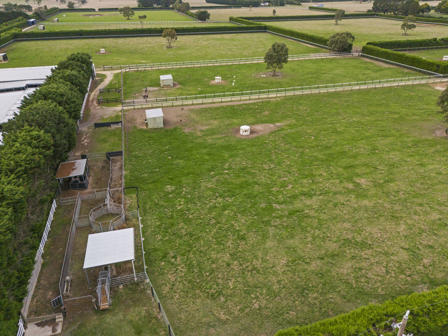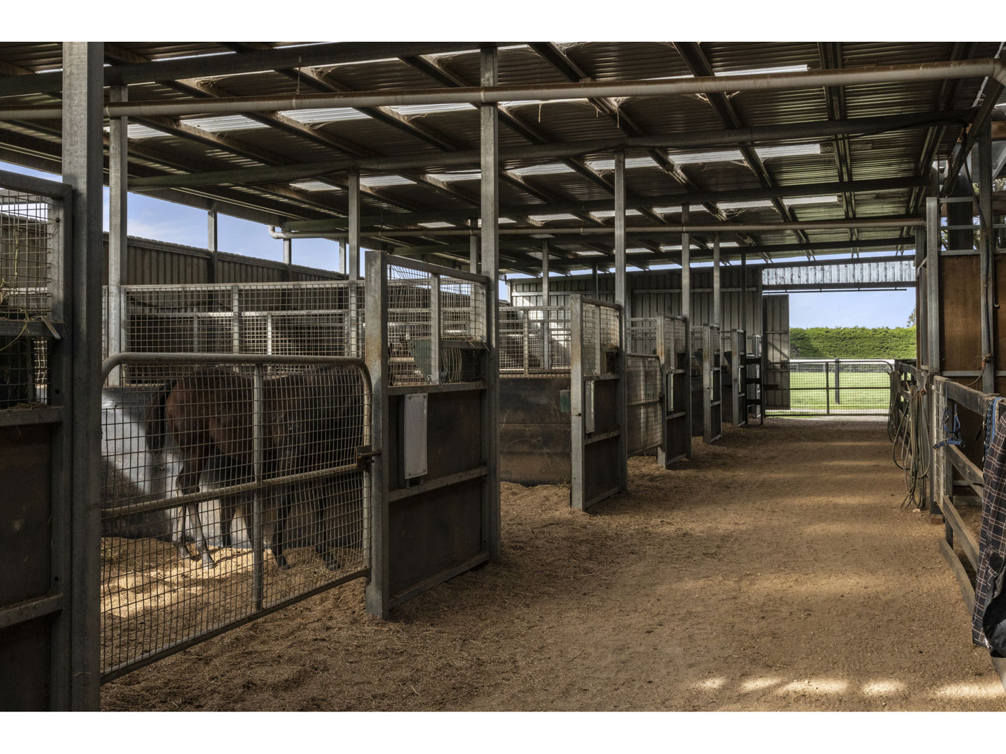 The stable block complex includes everything you’d expect of a high-end commercial enterprise including hot and cold wash bay, vet and rug room, undercover mare and foal crush, side and rear loading ramp, scales, enclosed scoping box, hourglass parade walk, and tearoom for staff members