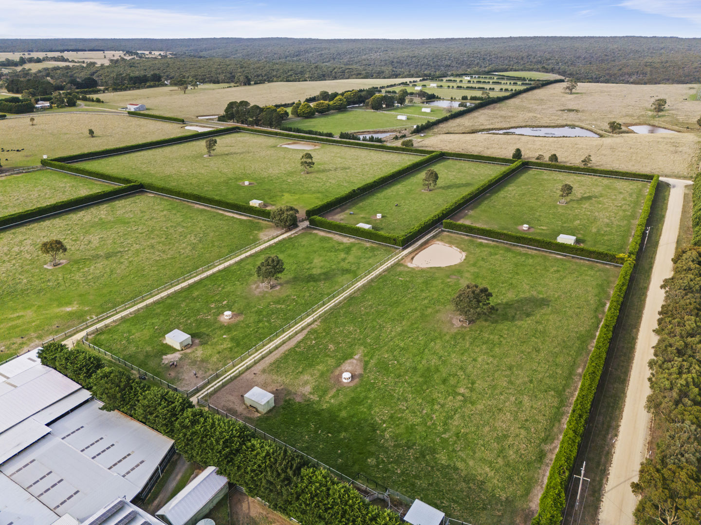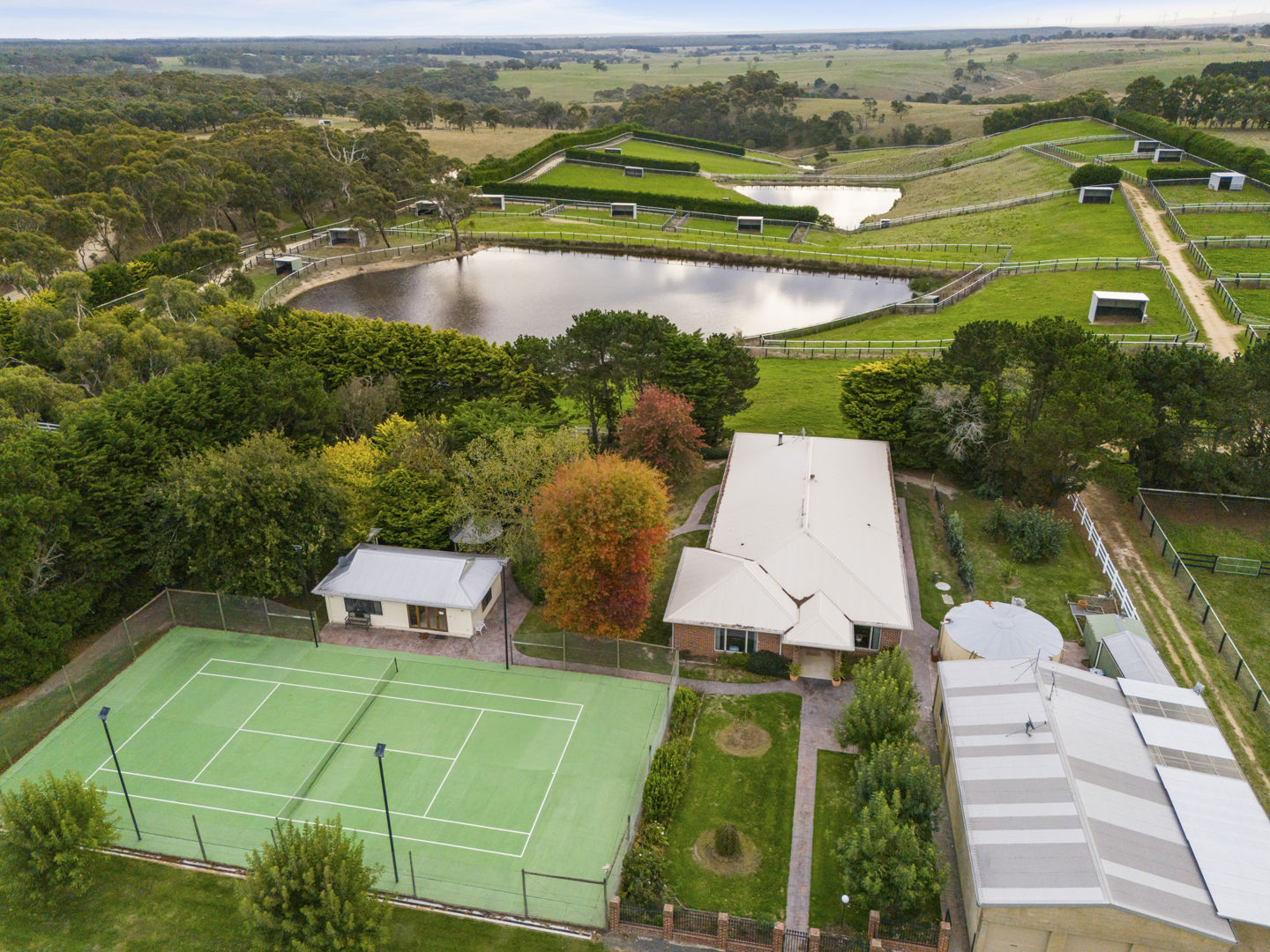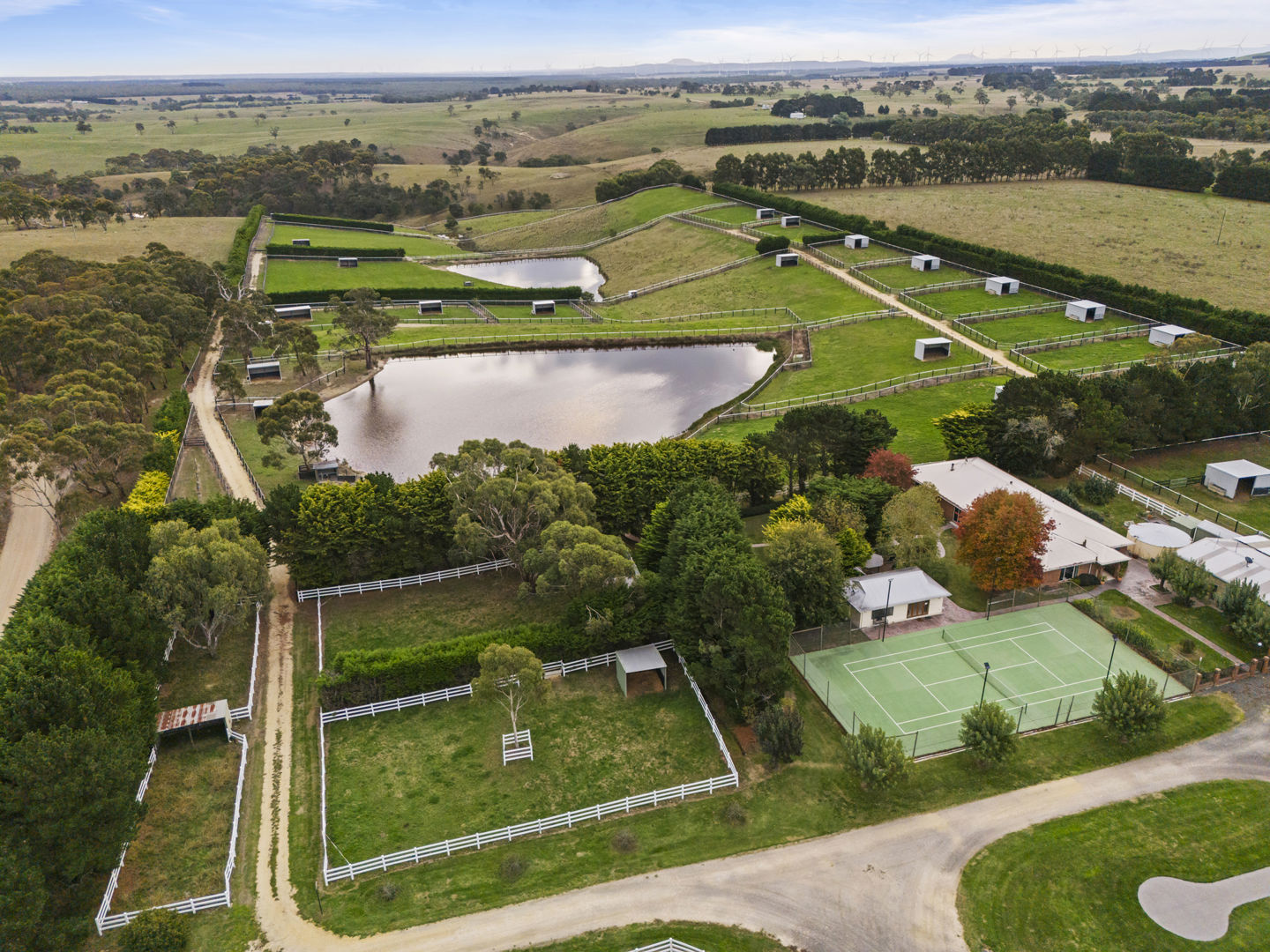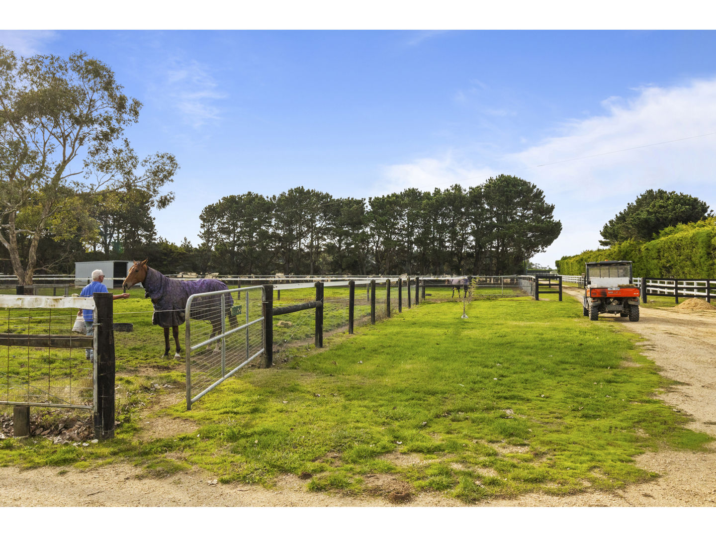 The stable block complex includes everything you’d expect of a high-end commercial enterprise including hot and cold wash bay, vet and rug room, undercover mare and foal crush, side and rear loading ramp, scales, enclosed scoping box, hourglass parade walk, and tearoom for staff members