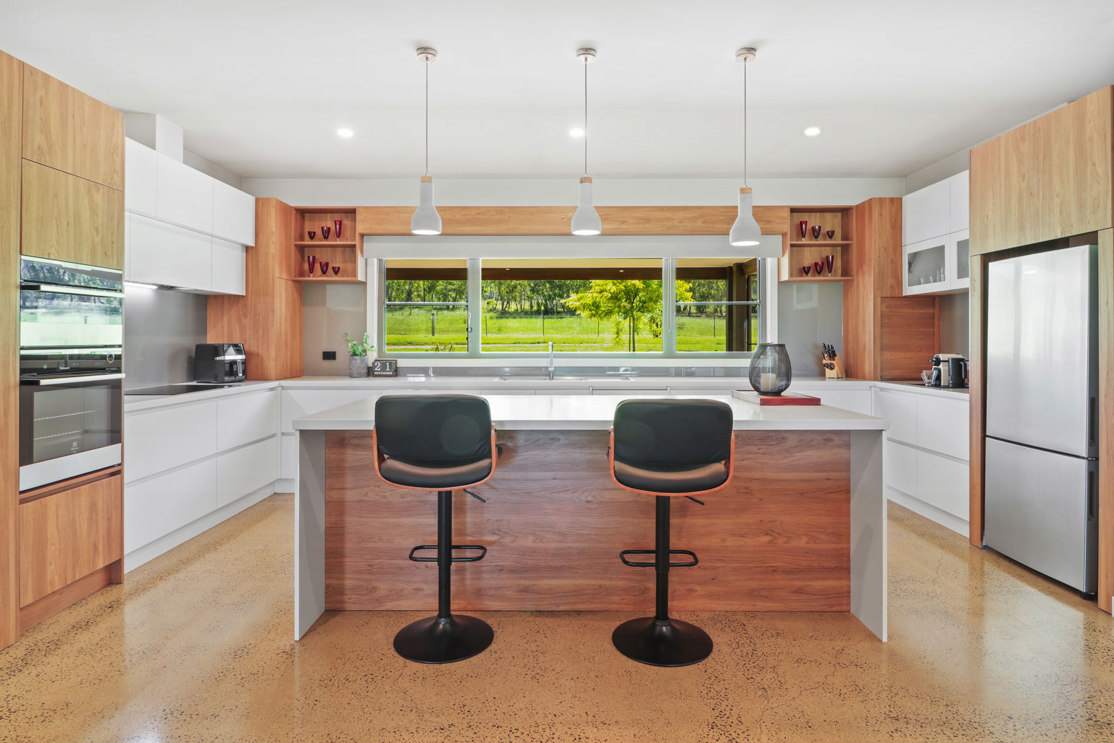 • Striking kitchen with stone benchtops and glass splash back.