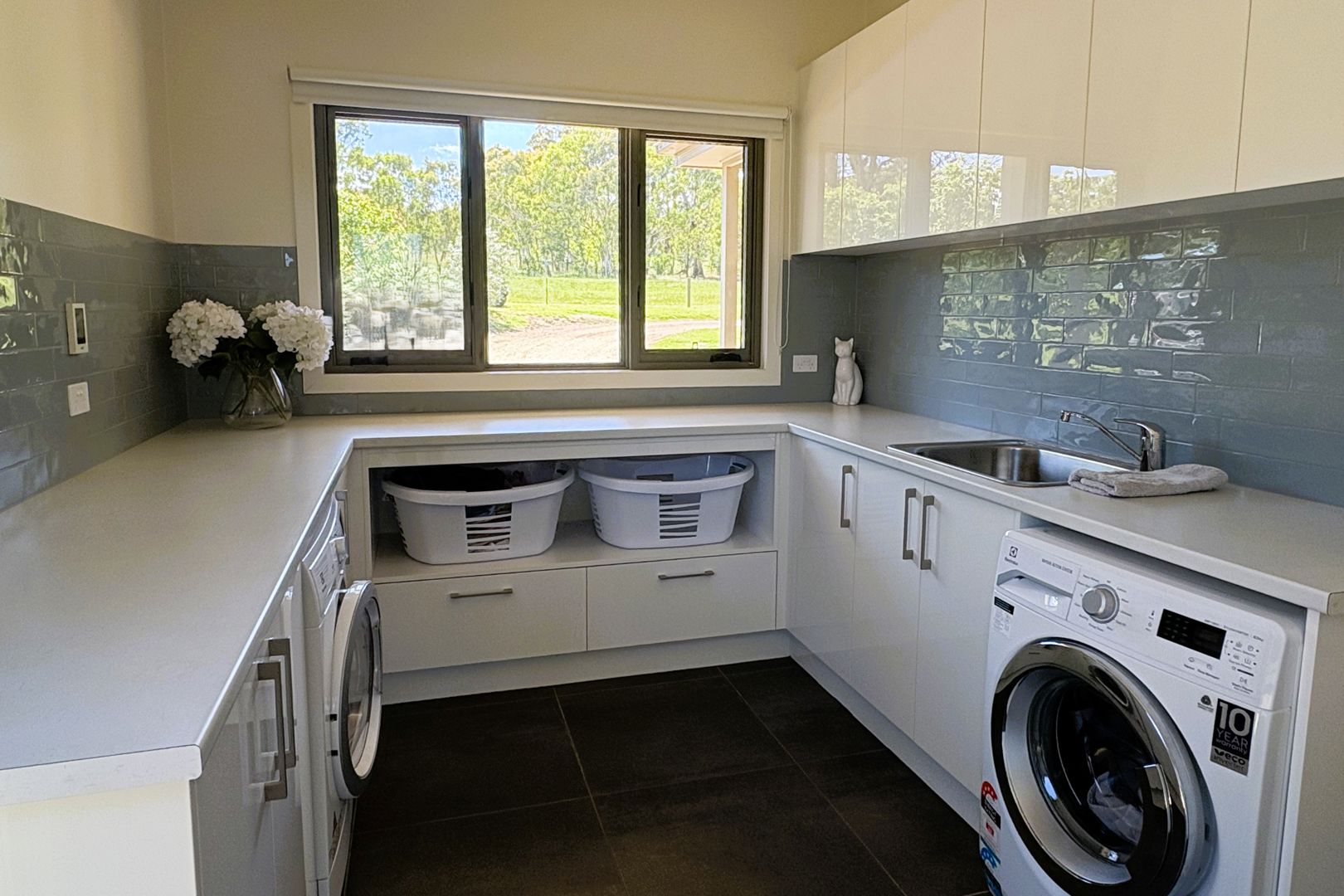 • Oversized laundry with custom cabinetry and underfloor heating.