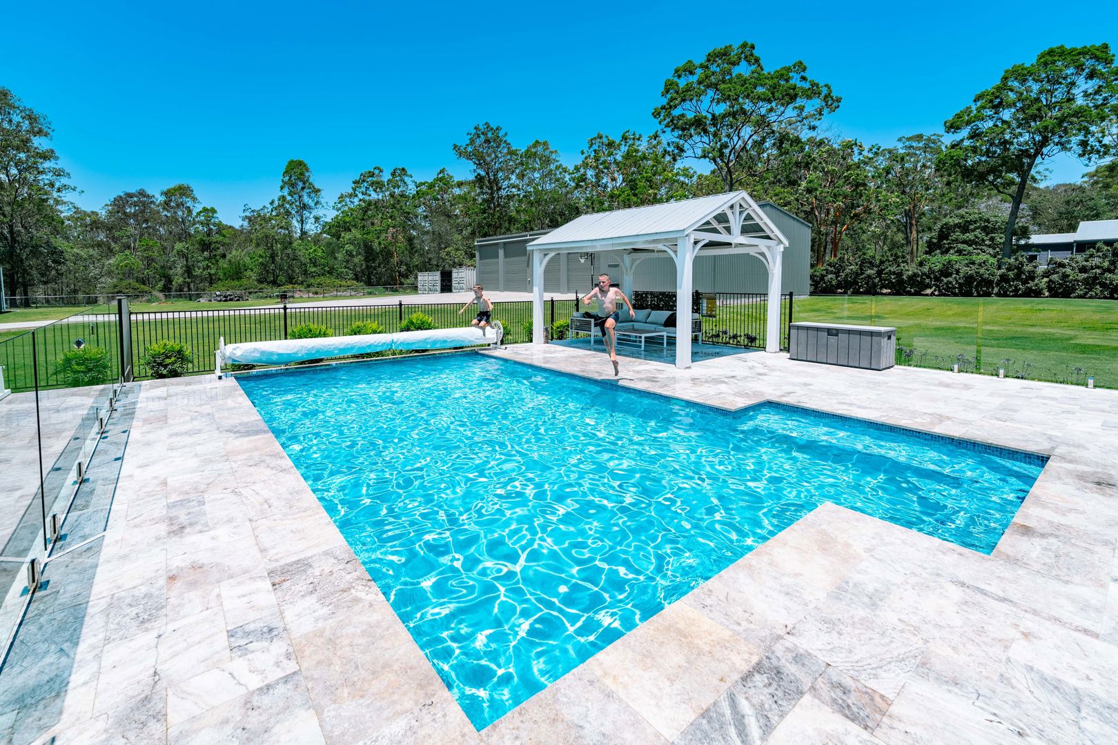 Step outside and you're greeted by a resort-style magnesium pool framed in natural stone, echoing the same material used around the internal fireplace. For families, the entire property is a dream: a flying fox stretches across the backyard, and a private bike and horse trail winds through the acreage, offering endless hours of outdoor fun and exploration.