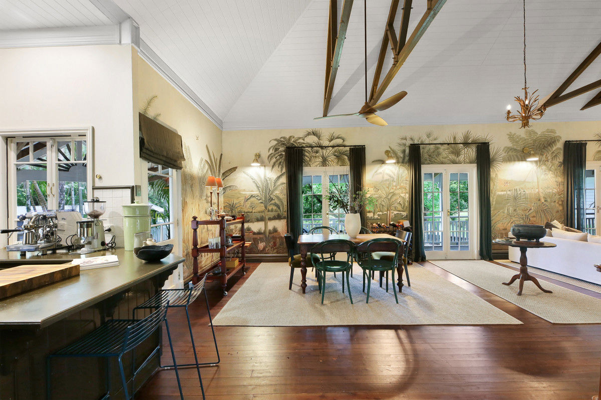 An unprecedented statement of charisma and charm, this contemporary Queenslander blends old-world romance with boutique elegance. Set amongst 6.18 tranquil acres, its classic country façade evokes timeless beauty, while the interiors exude a warm yet worldly flair. Emulating this is the expansive living and dining zone, where hand-painted, custom-ordered IKSEL wallpaper adds a sophisticated British Colonial/Caribbean ambience.