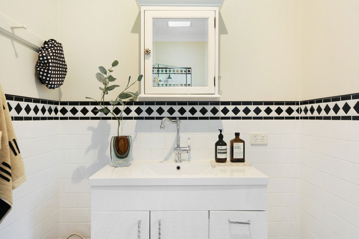 Combined bathroom and laundry with traditional monochromatic tessellated tiling