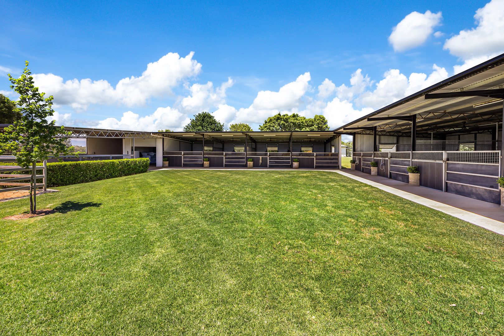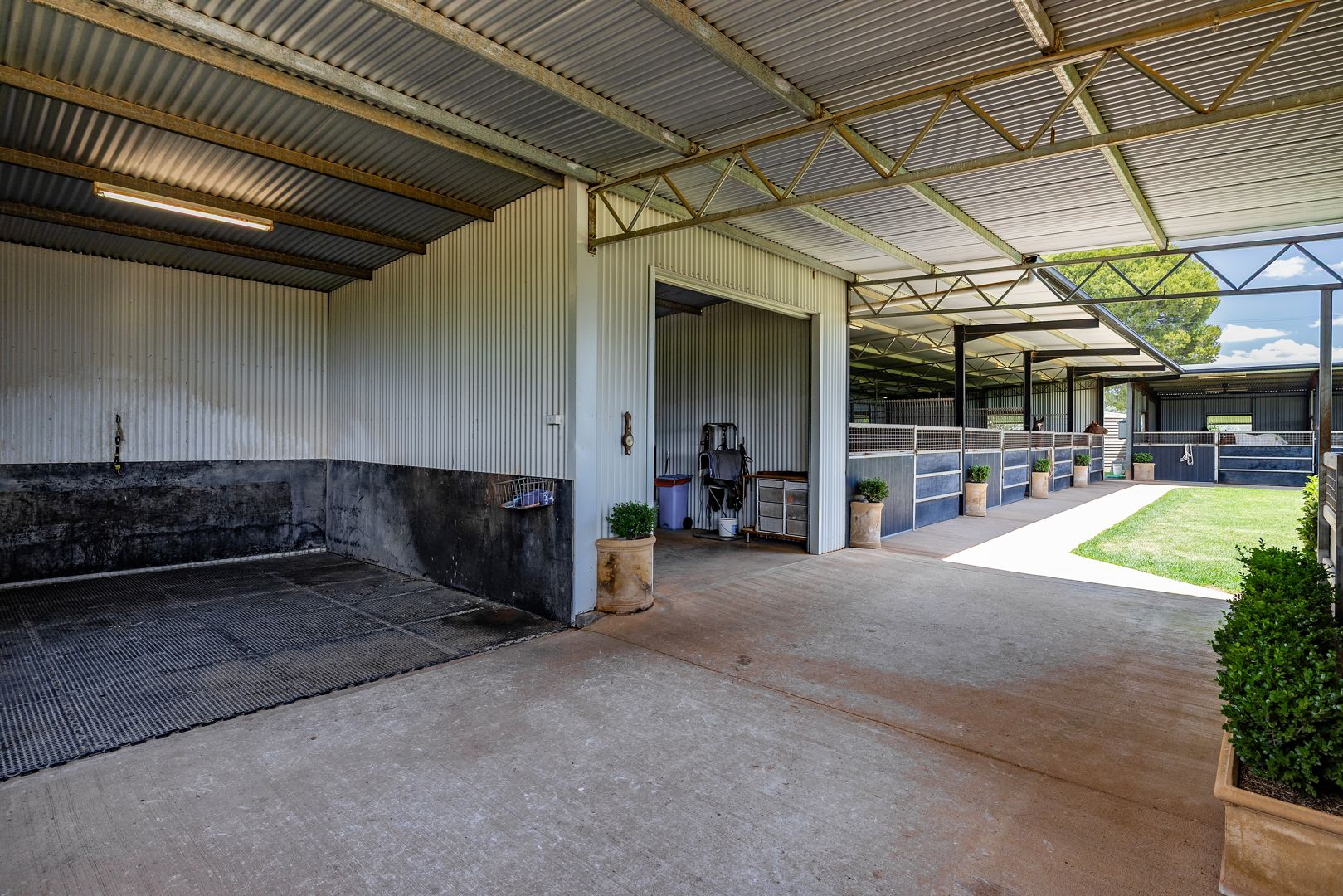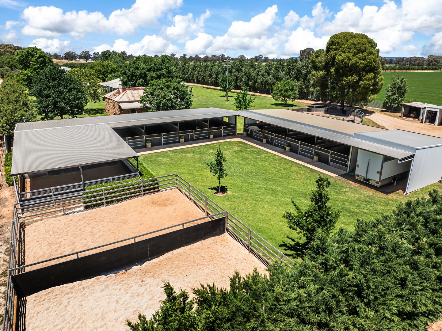 - COMPLEX ONE: Eight 4.5mx7.5m stables, 9mx8m covered roll, Drive through truck shed, Two day yards.
